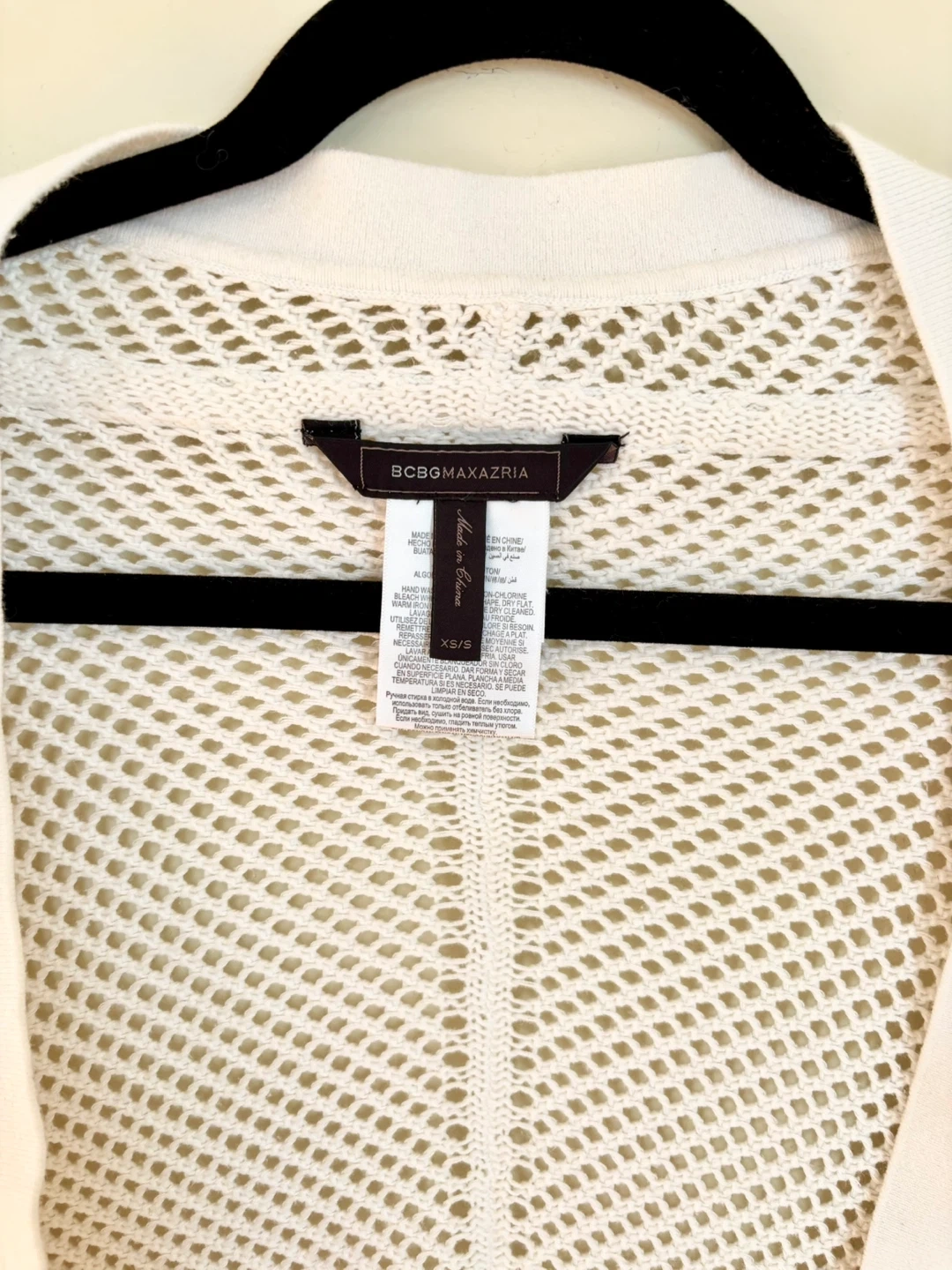 This is a BCBGMAXAZRIA crochet cardigan in a size XS/S. It's a beautiful white colour and made of 100% cotton.