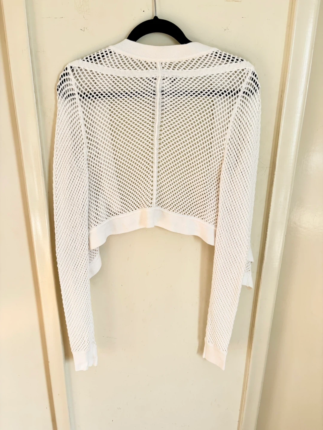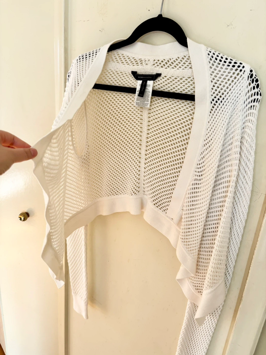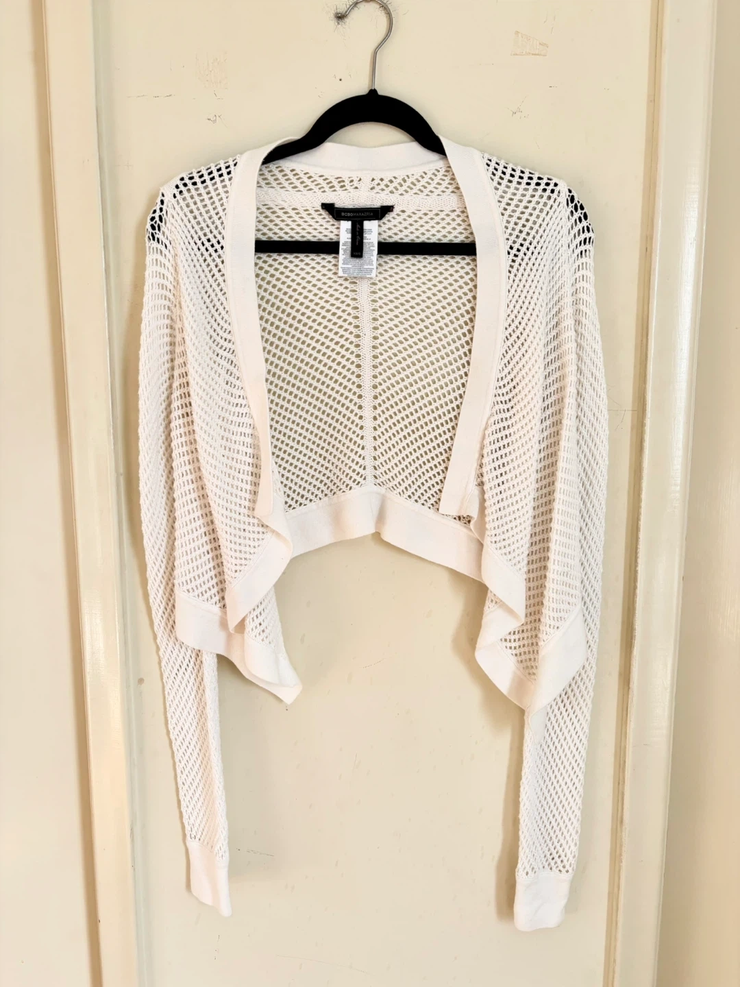 This is a BCBGMAXAZRIA crochet cardigan in a size XS/S. It's a beautiful white colour and made of 100% cotton.