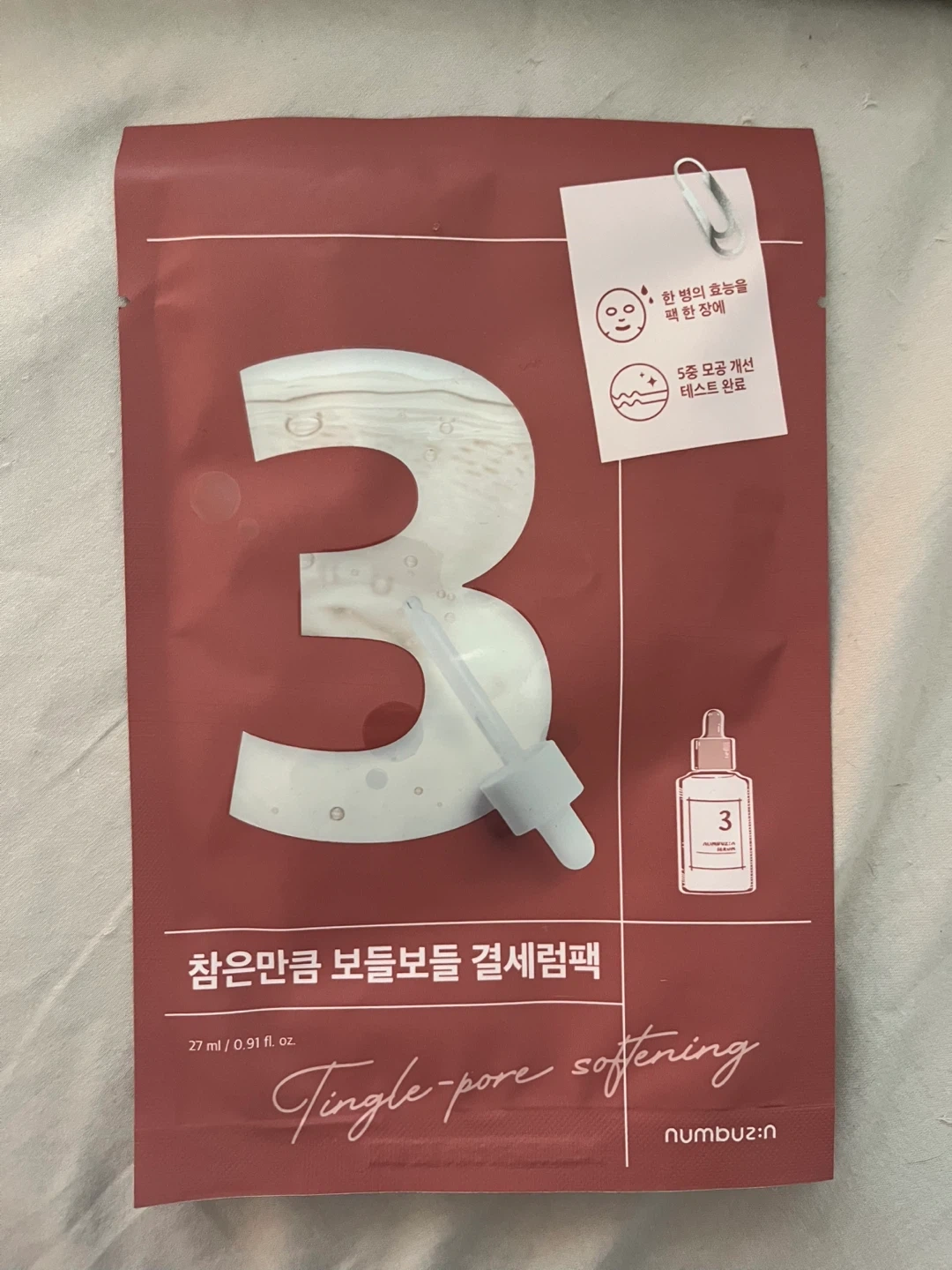 Selling a numbuzin No.3 Tingle-pore Softening sheet mask! This mask contains 27 ml / 0.91 fl. oz. of serum and is designed to improve pores and soften skin