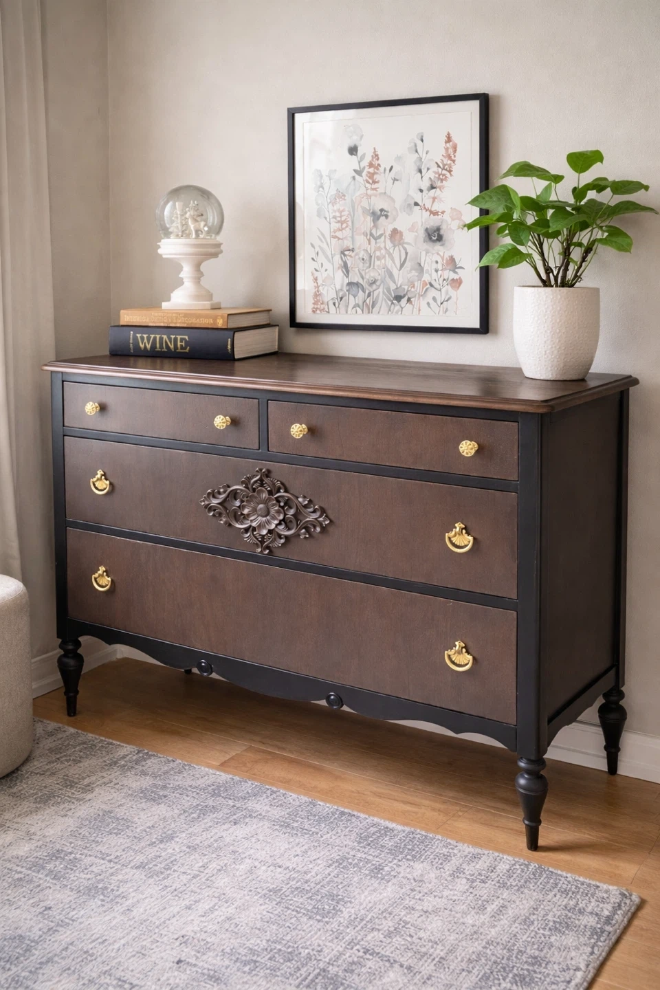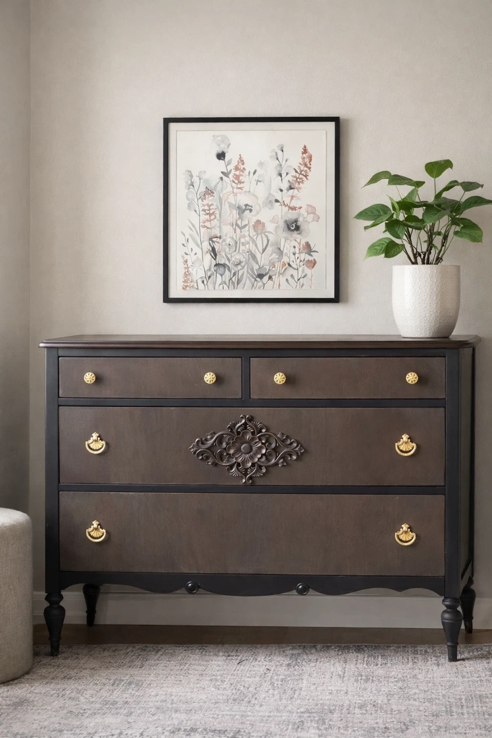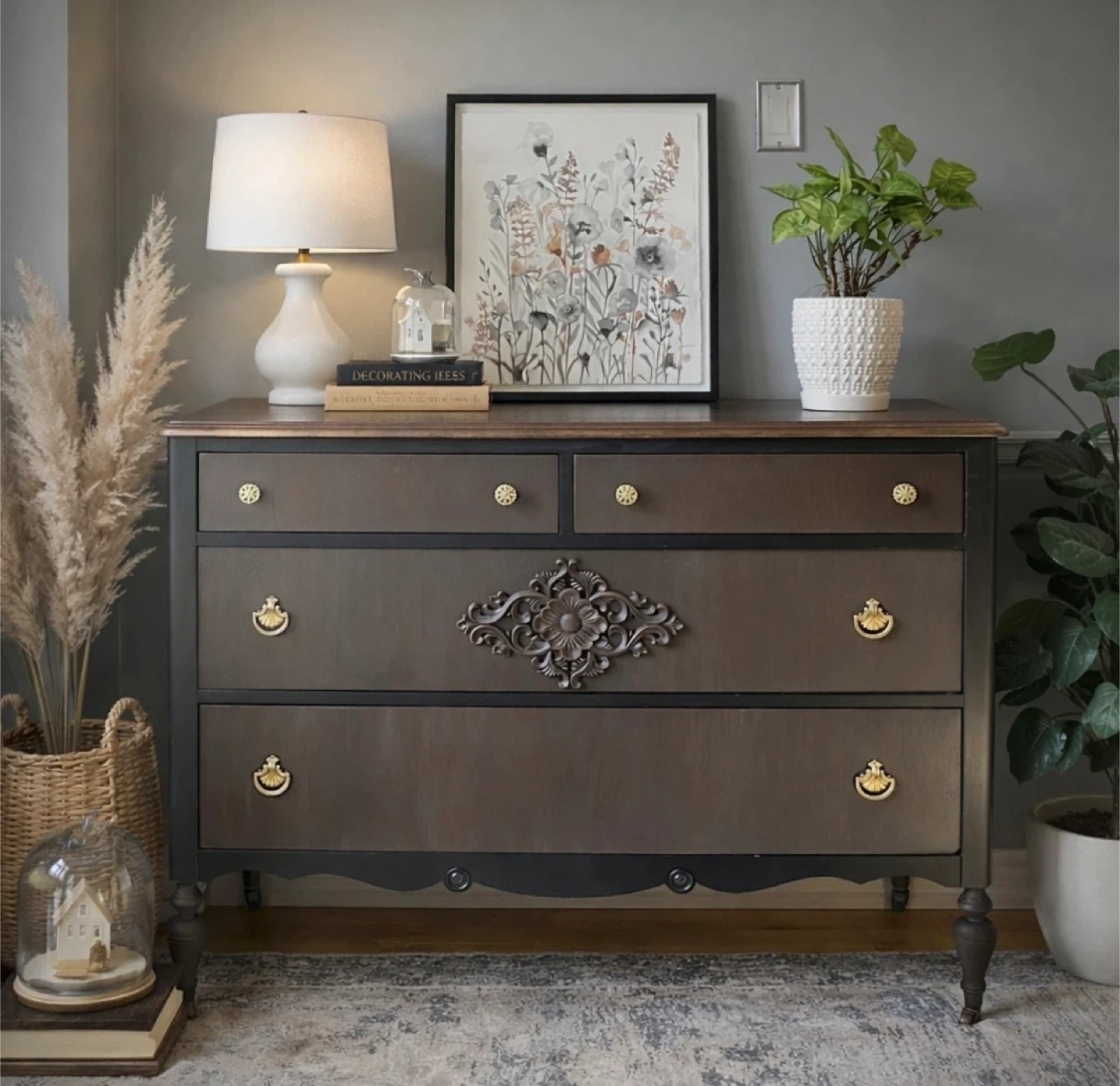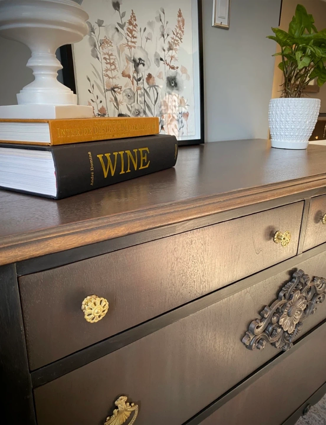 Crafted from solid walnut, this piece has been thoughtfully refinished to highlight its natural beauty while preserving its original charm. The top, drawer fronts, and front legs were stripped and stained in Cappuccino, bringing out the rich walnut grain. The body is finished in Coal Black, creating an elegant contrast that works beautifully in both classic and contemporary interiors.