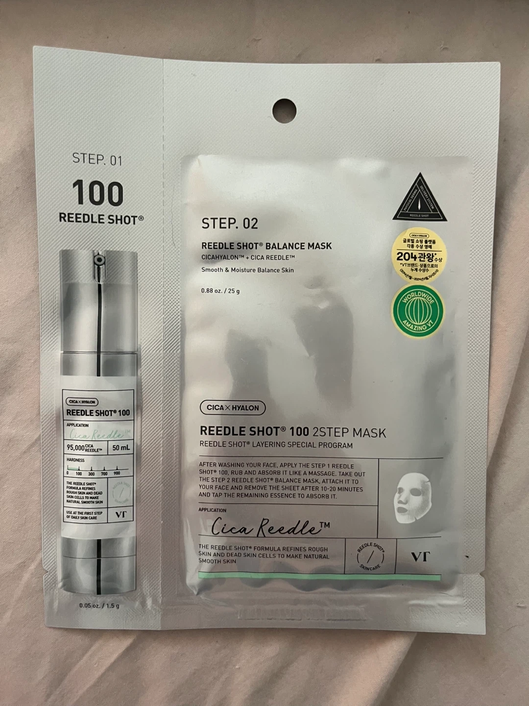 Selling a VT Cica Reedle Shot 100 and Balance Mask set! It's designed to refine rough skin and remove dead skin cells for a natural, smooth finish. The set includes the Reedle Shot 100 (50ml) and the Reedle Shot Balance Mask (0.88 oz / 25g).