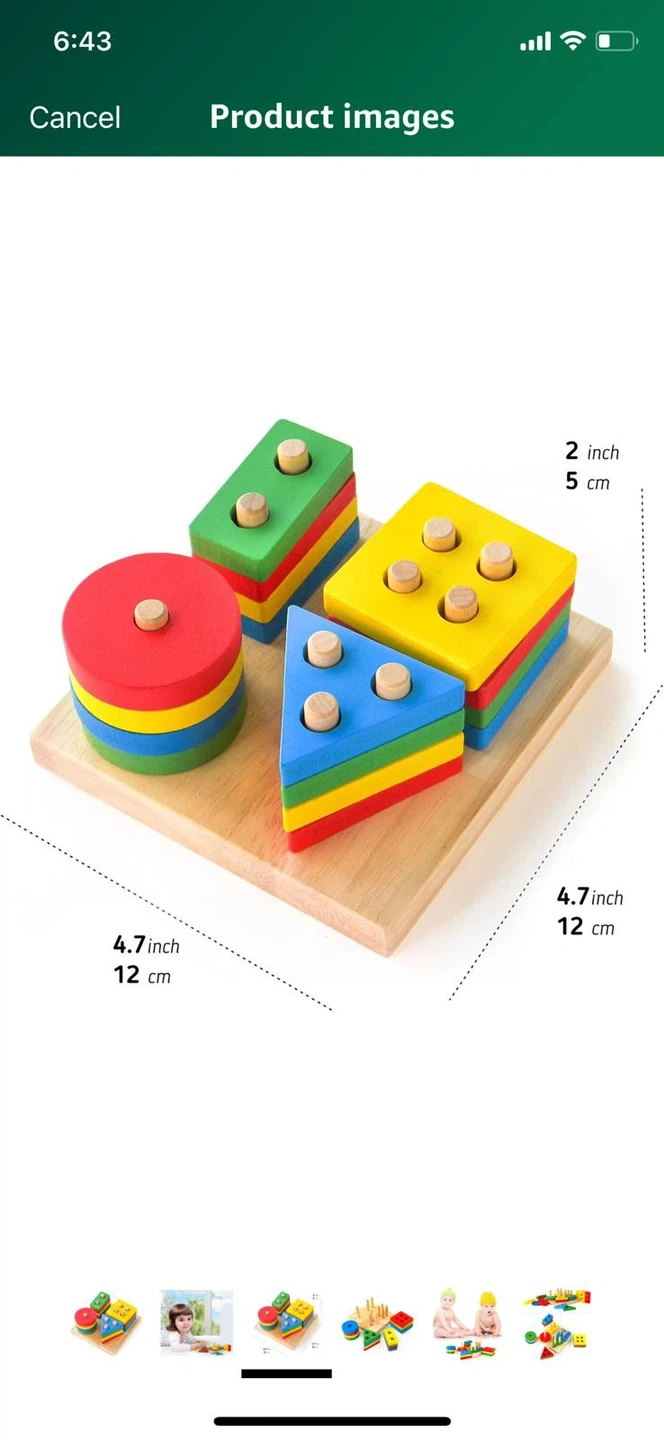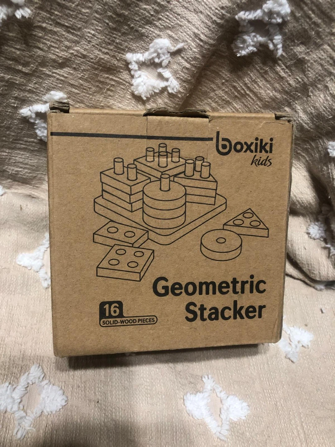 I'm selling a Boxiki Kids Geometric Stacker toy. It's a fun and educational toy for kids. The toy includes 16 solid-wood pieces. It also comes with the original box!