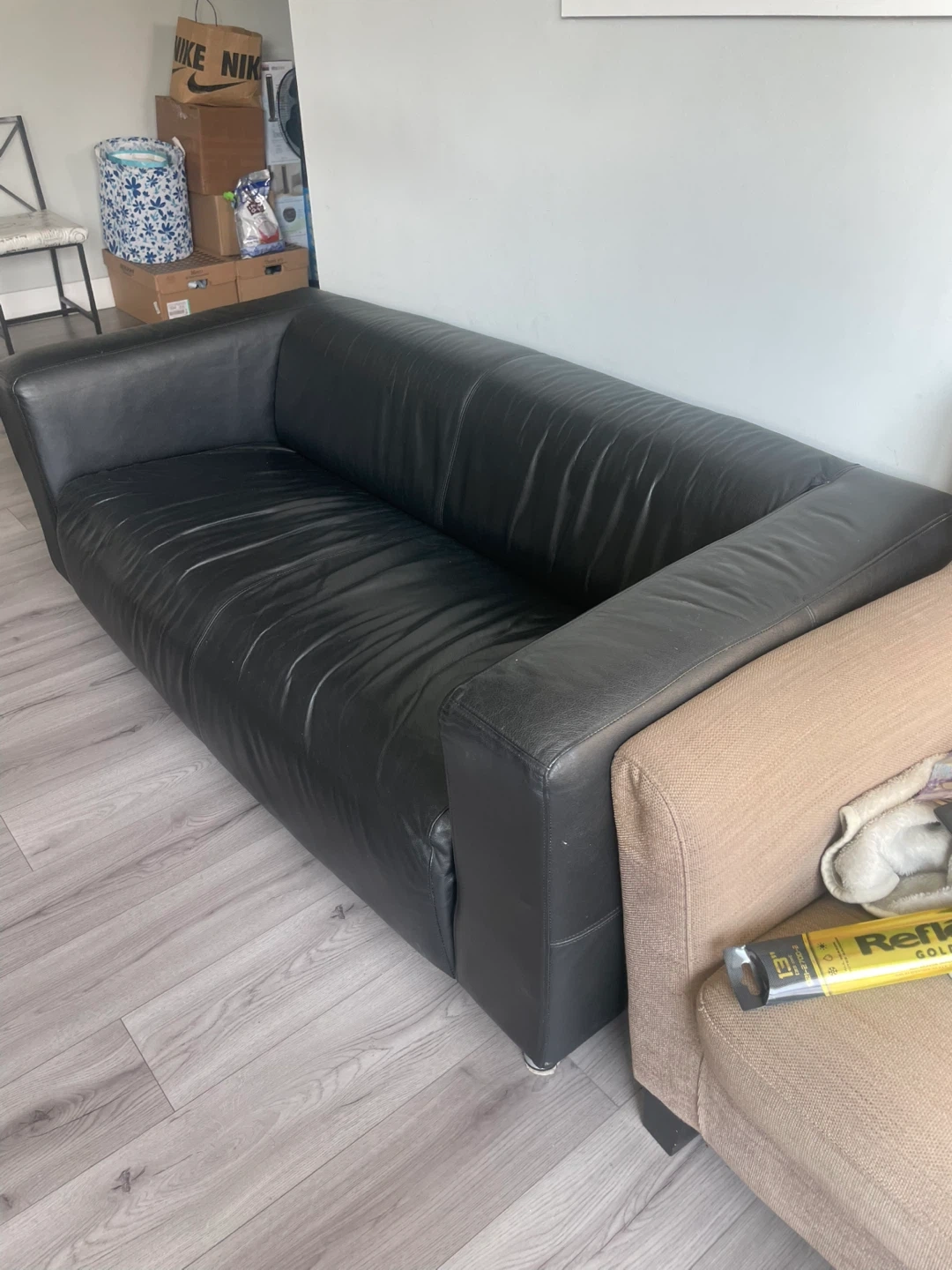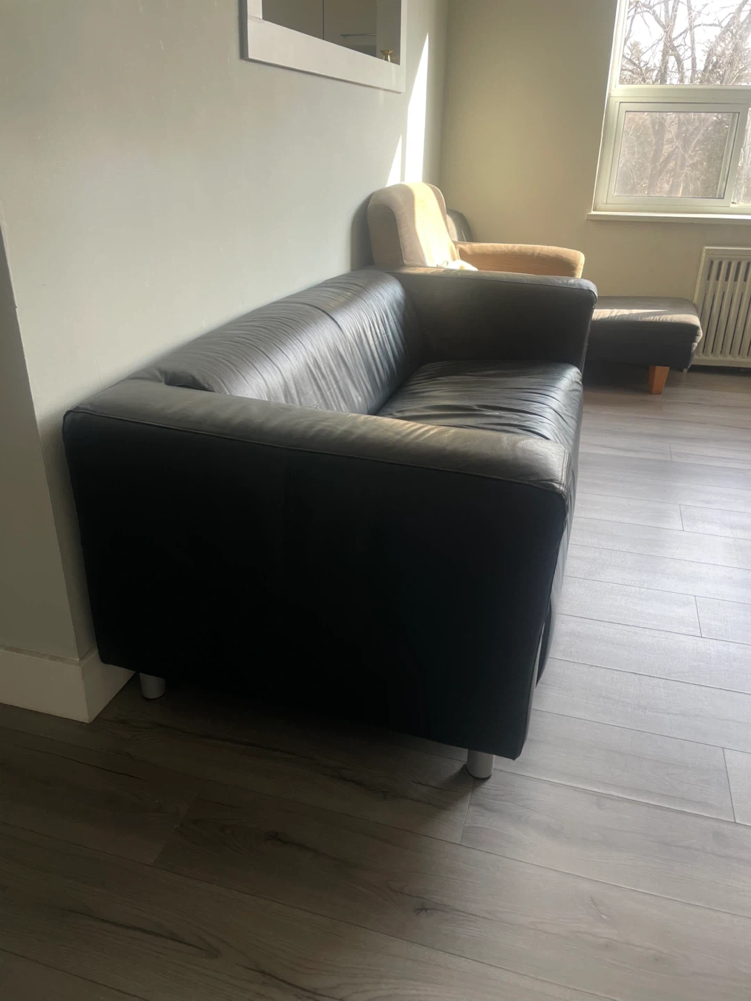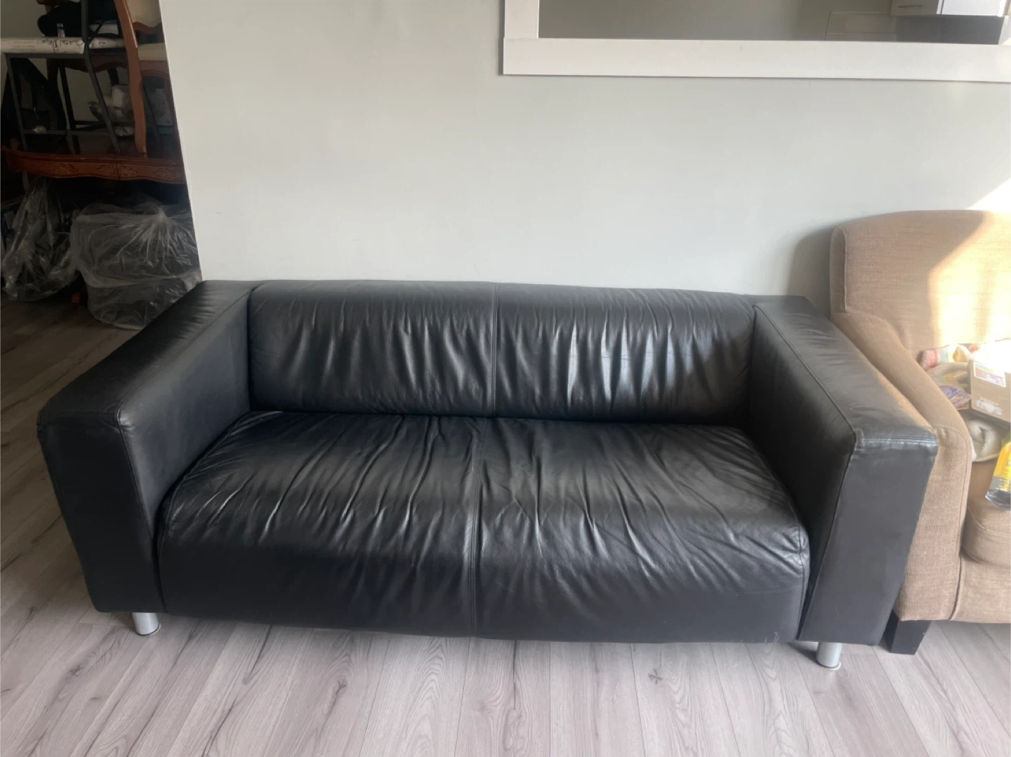 Selling a black leather sofa. It's in good condition and measures approximately 1.76m in length, 88cm in width, and 65cm in height. Perfect for a living room or den!
