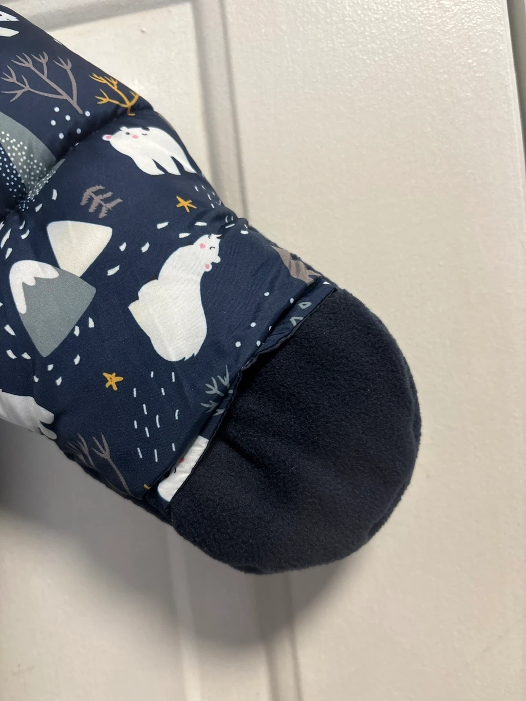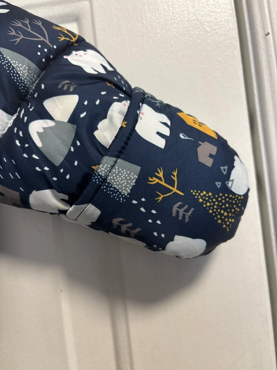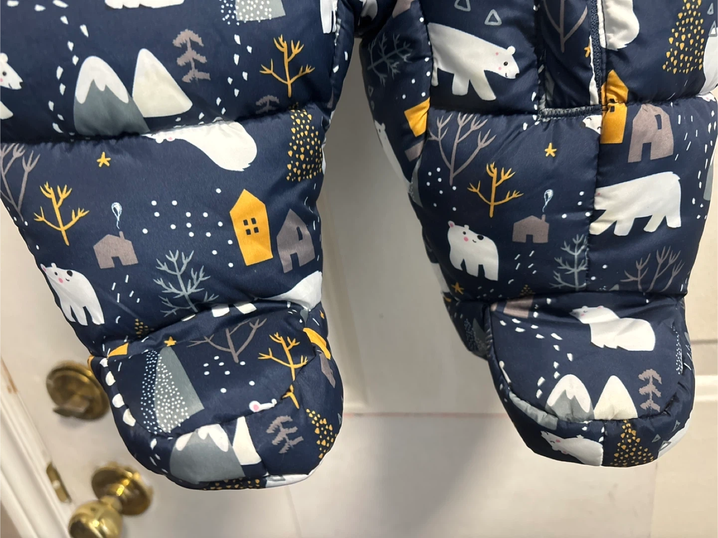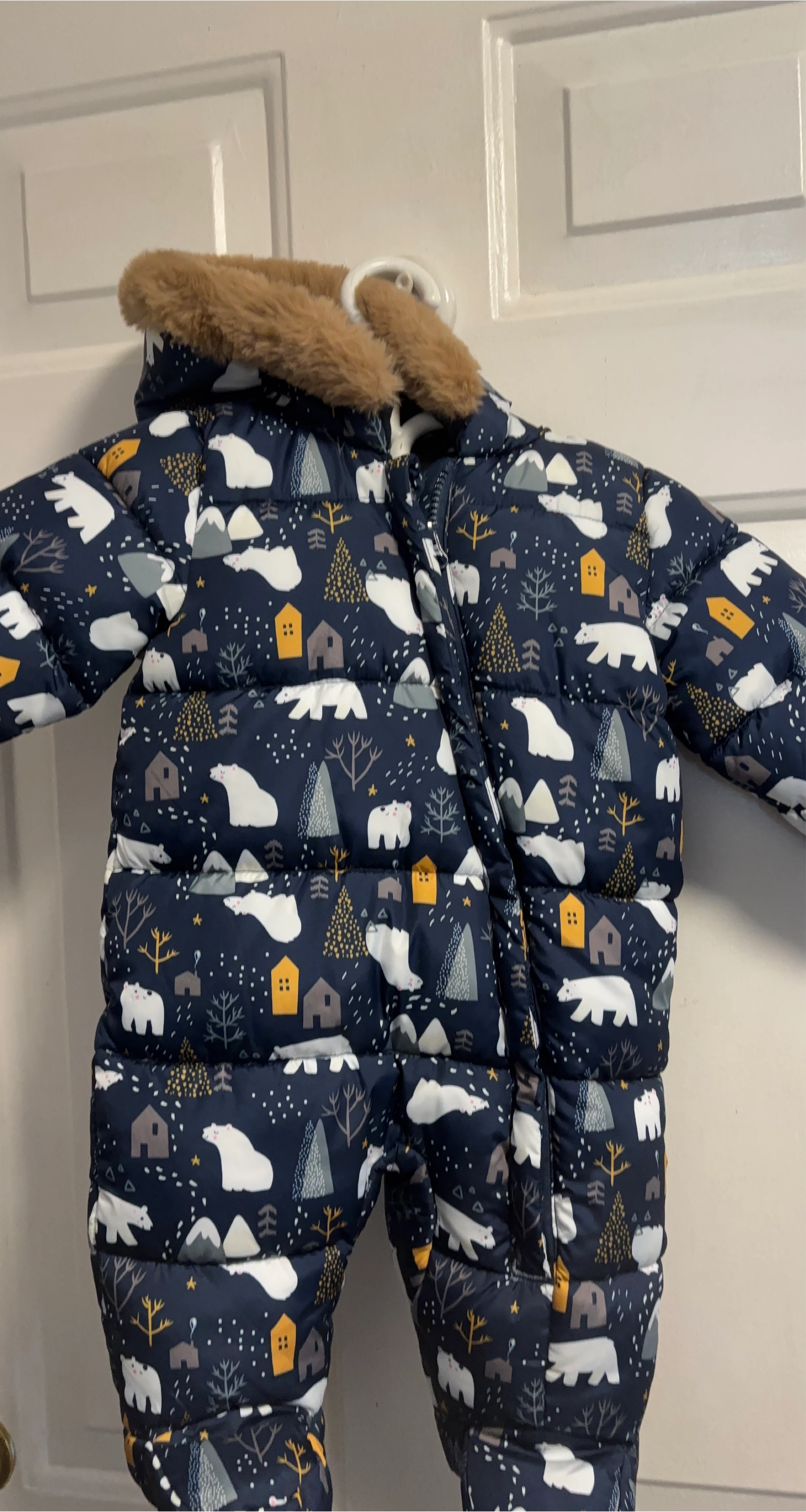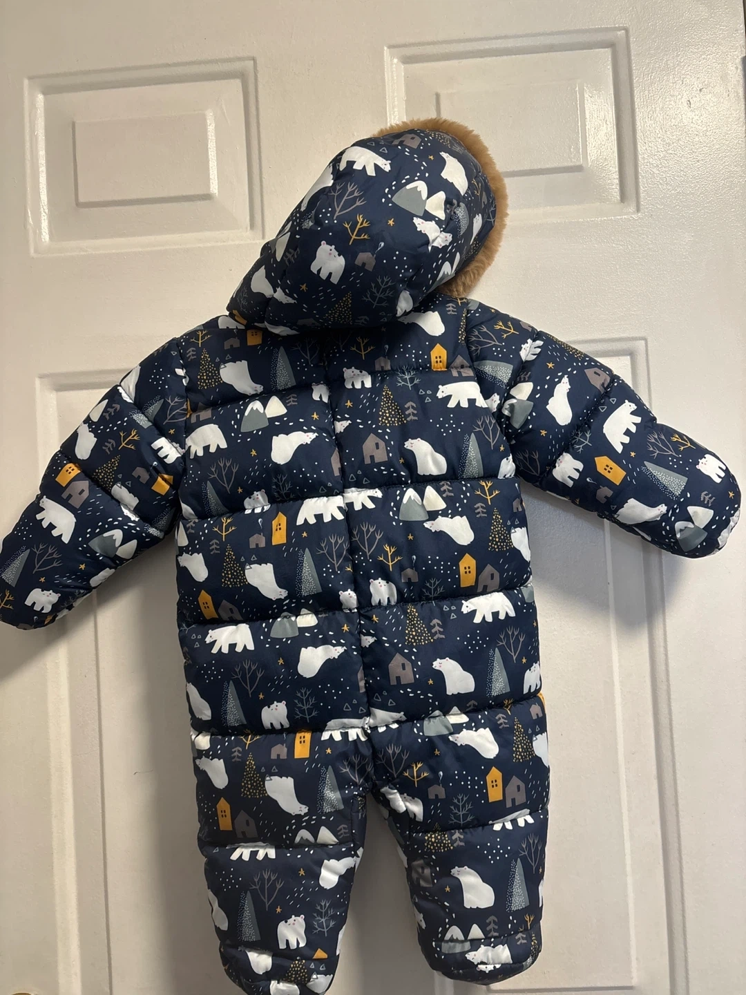Keep your little one warm this winter with this adorable padded snowsuit! It features a cute bear and winter scenery pattern all over. The snowsuit has a hood with faux fur trim and built-in mittens and booties to keep tiny hands and feet cozy. Perfect for snowy adventures!