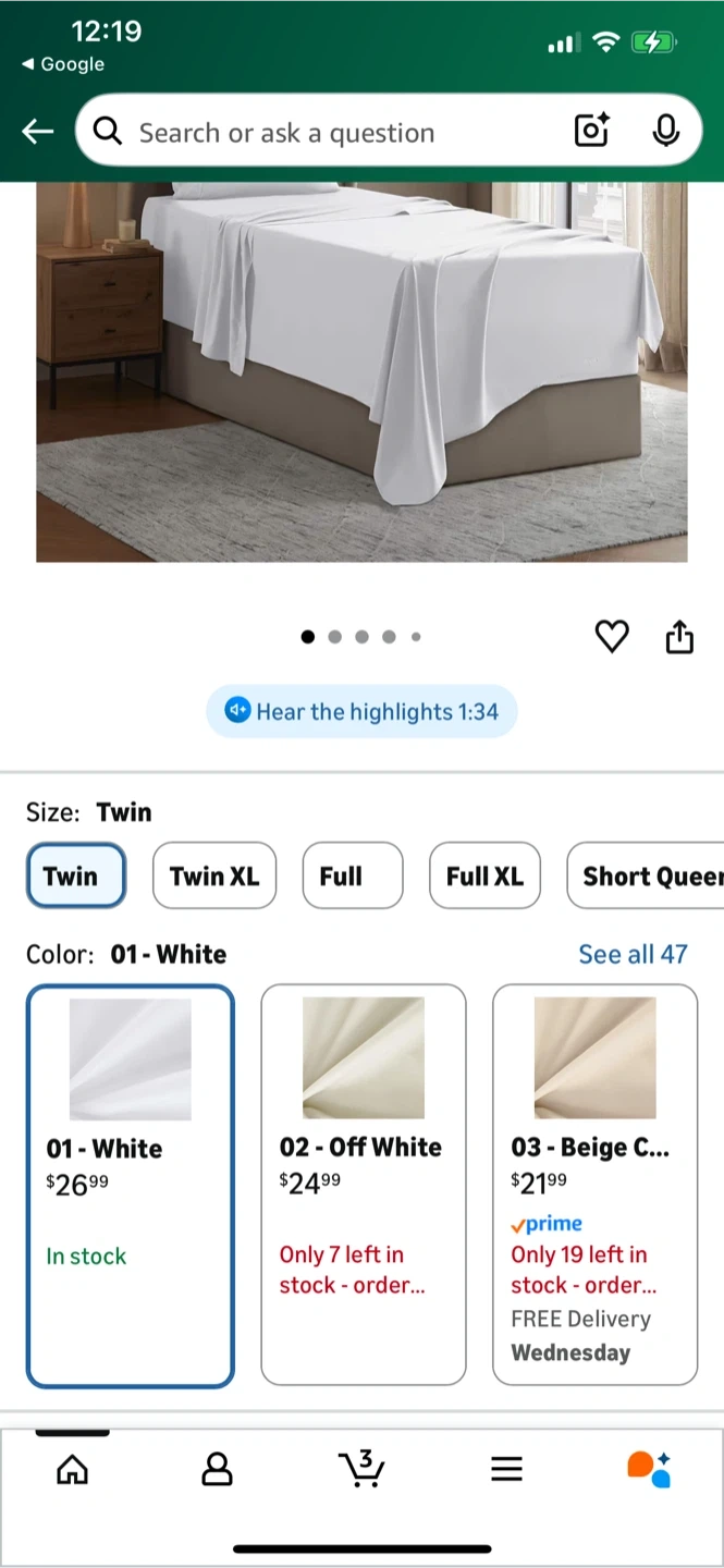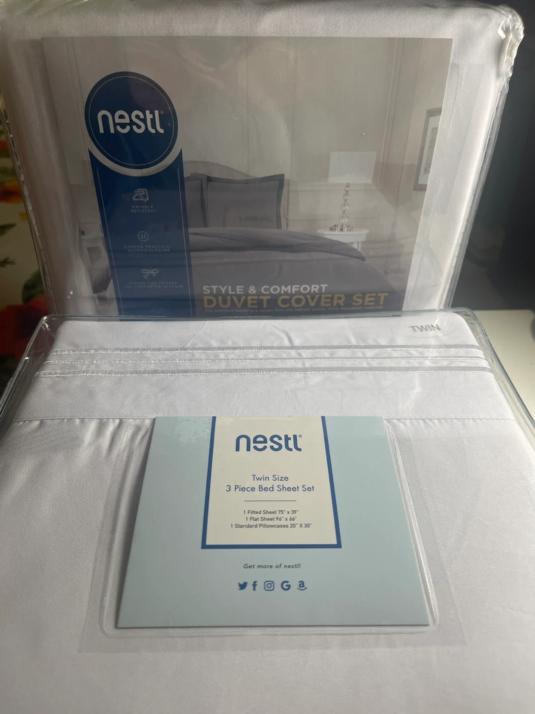 Brand new - Nestl twin-size duvet cover set and a 3-piece bed sheet set. The sheet set includes one fitted sheet (75" x 39") and one standard pillowcase (20" x 30"). They are both white. $54 + tax on Amazon