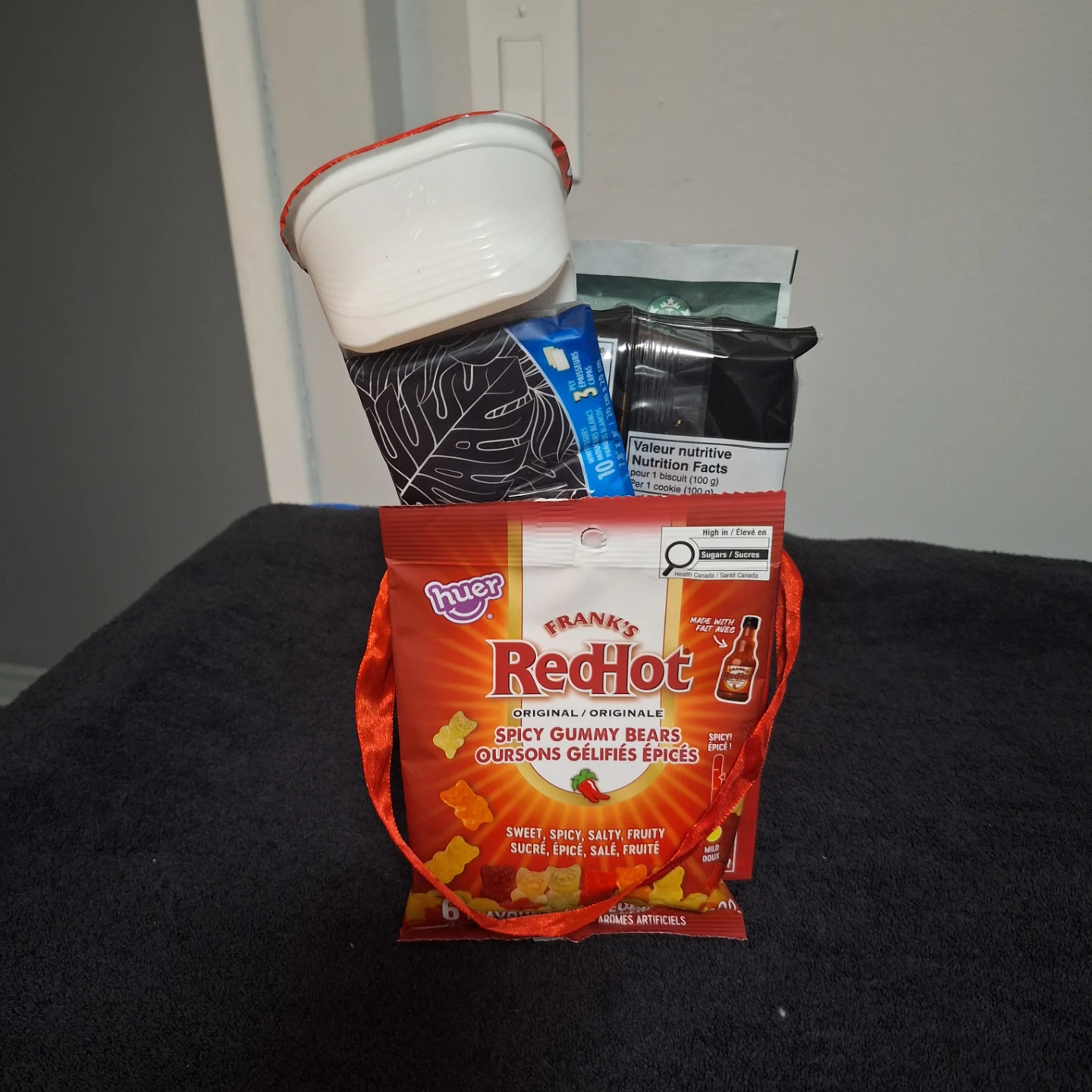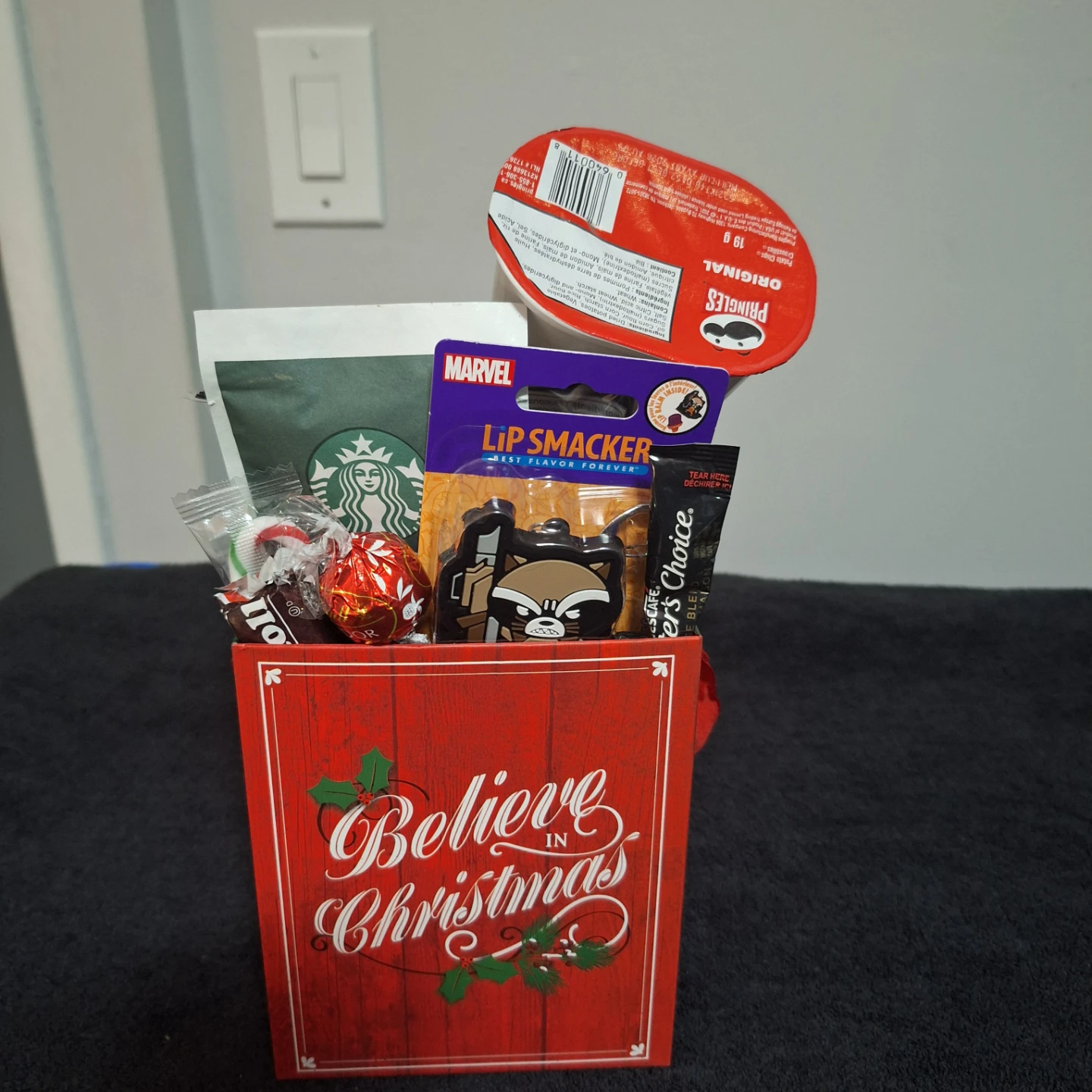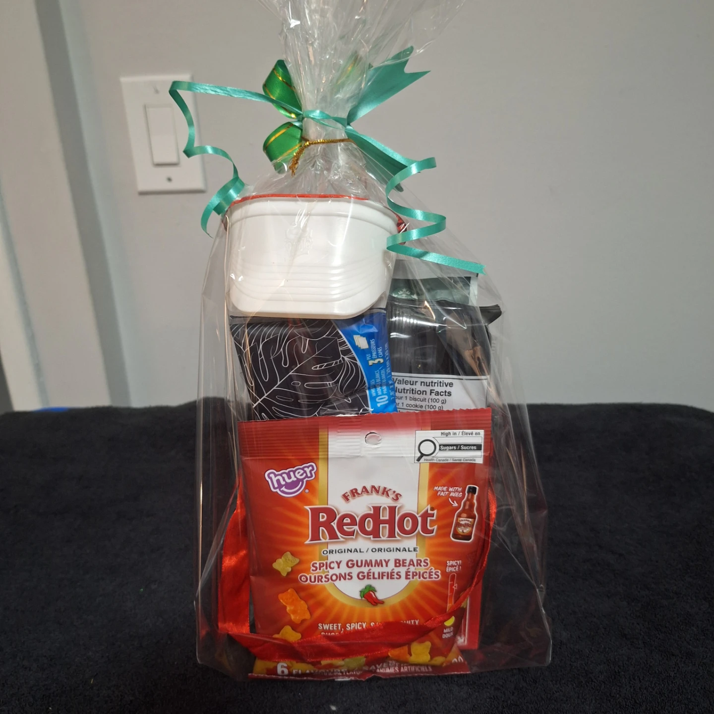 I have a holiday gift basket filled with a variety of treats! It includes items like Starbucks hot chocolate, Frank's RedHot spicy gummy bears, Pringles, Big Daddy cookie, and a Marvel Lip Smacker. Perfect for a little holiday cheer!