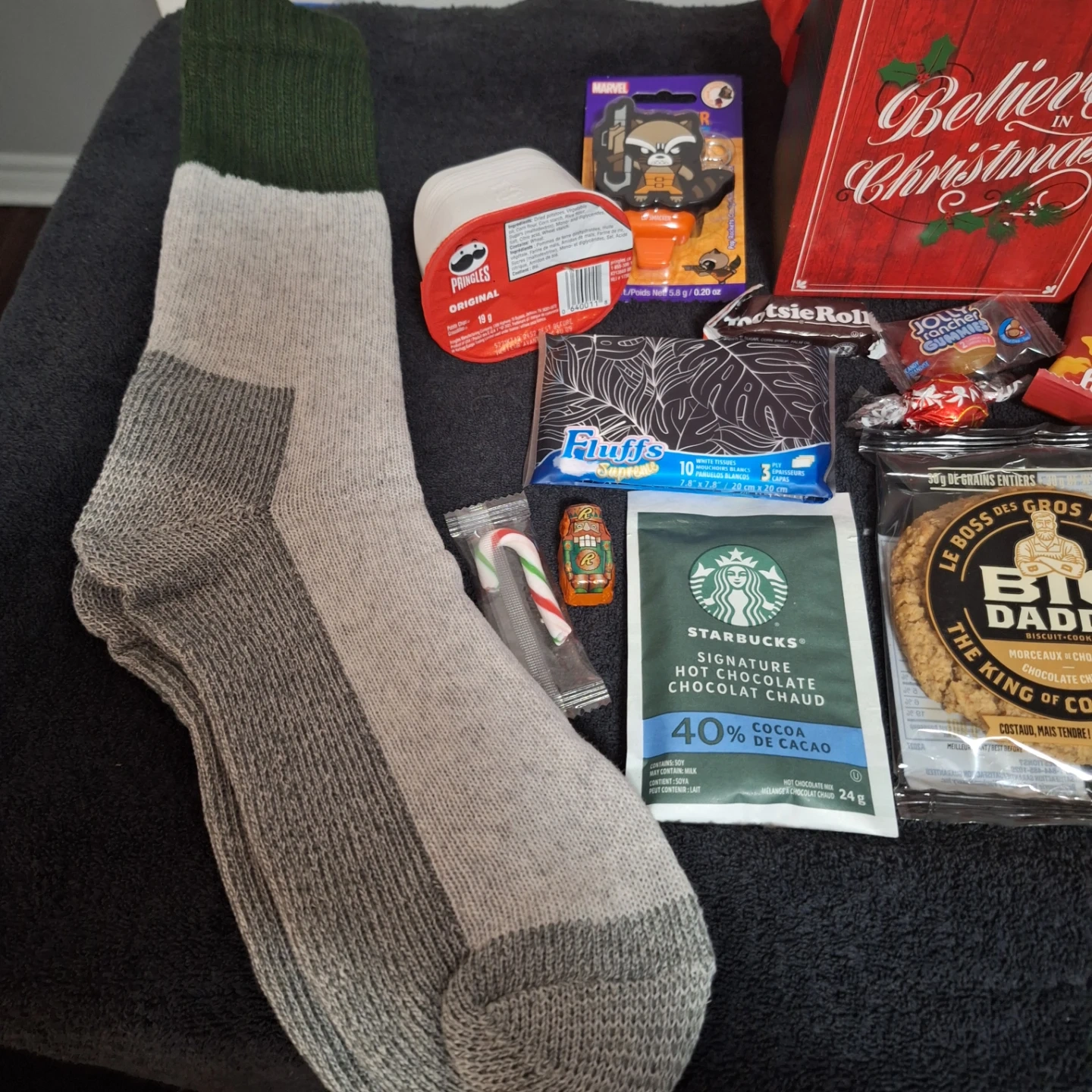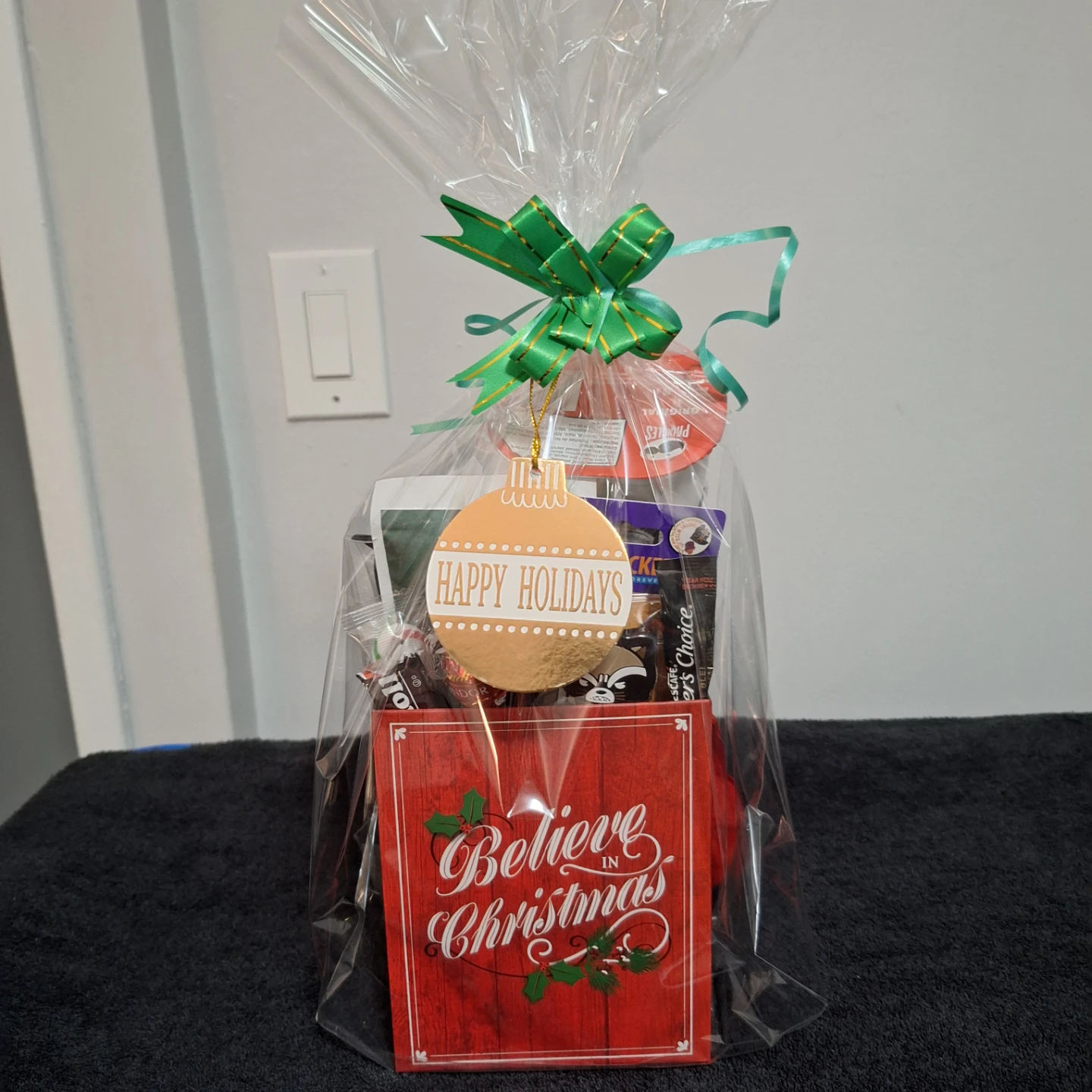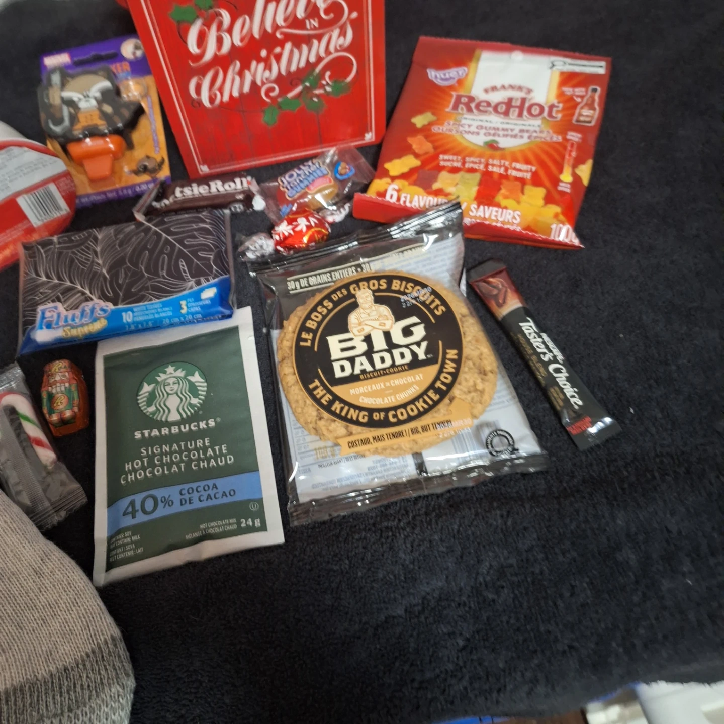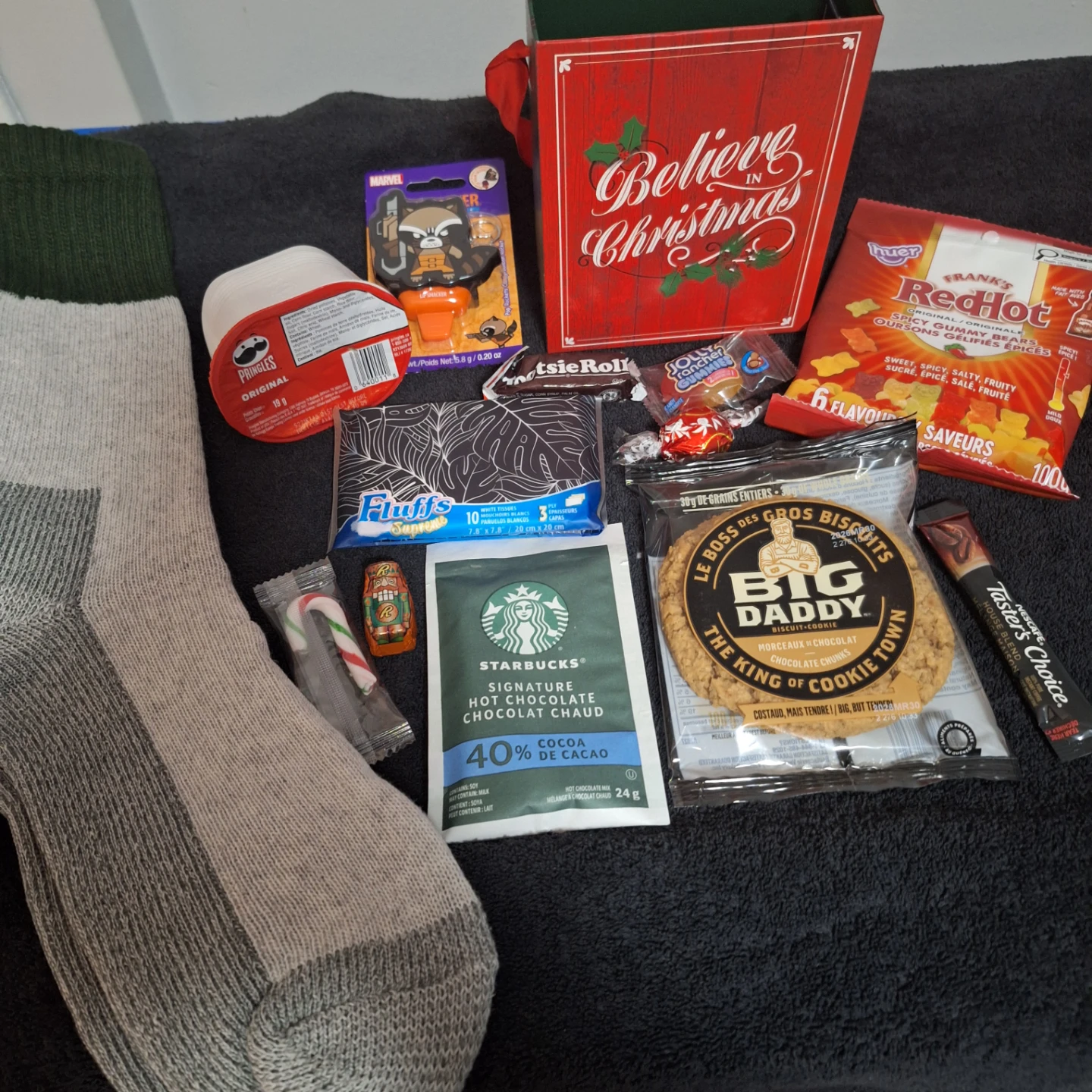 I have a holiday gift basket filled with a variety of treats! It includes items like Starbucks hot chocolate, Frank's RedHot spicy gummy bears, Pringles, Big Daddy cookie, and a Marvel Lip Smacker. Perfect for a little holiday cheer!