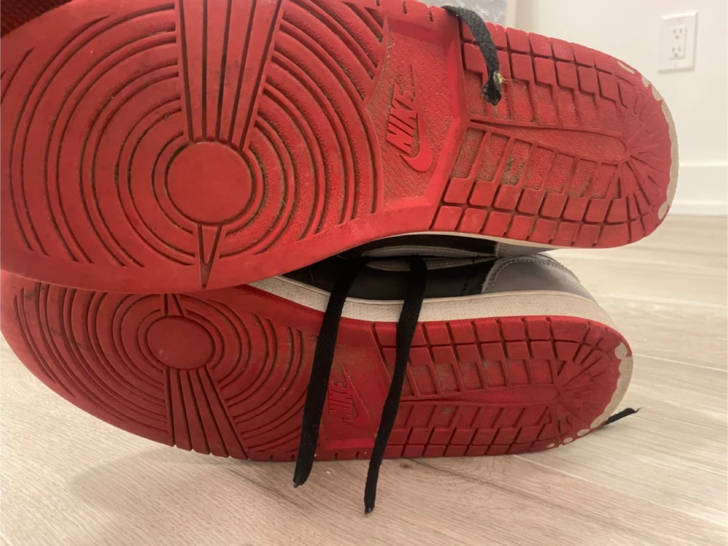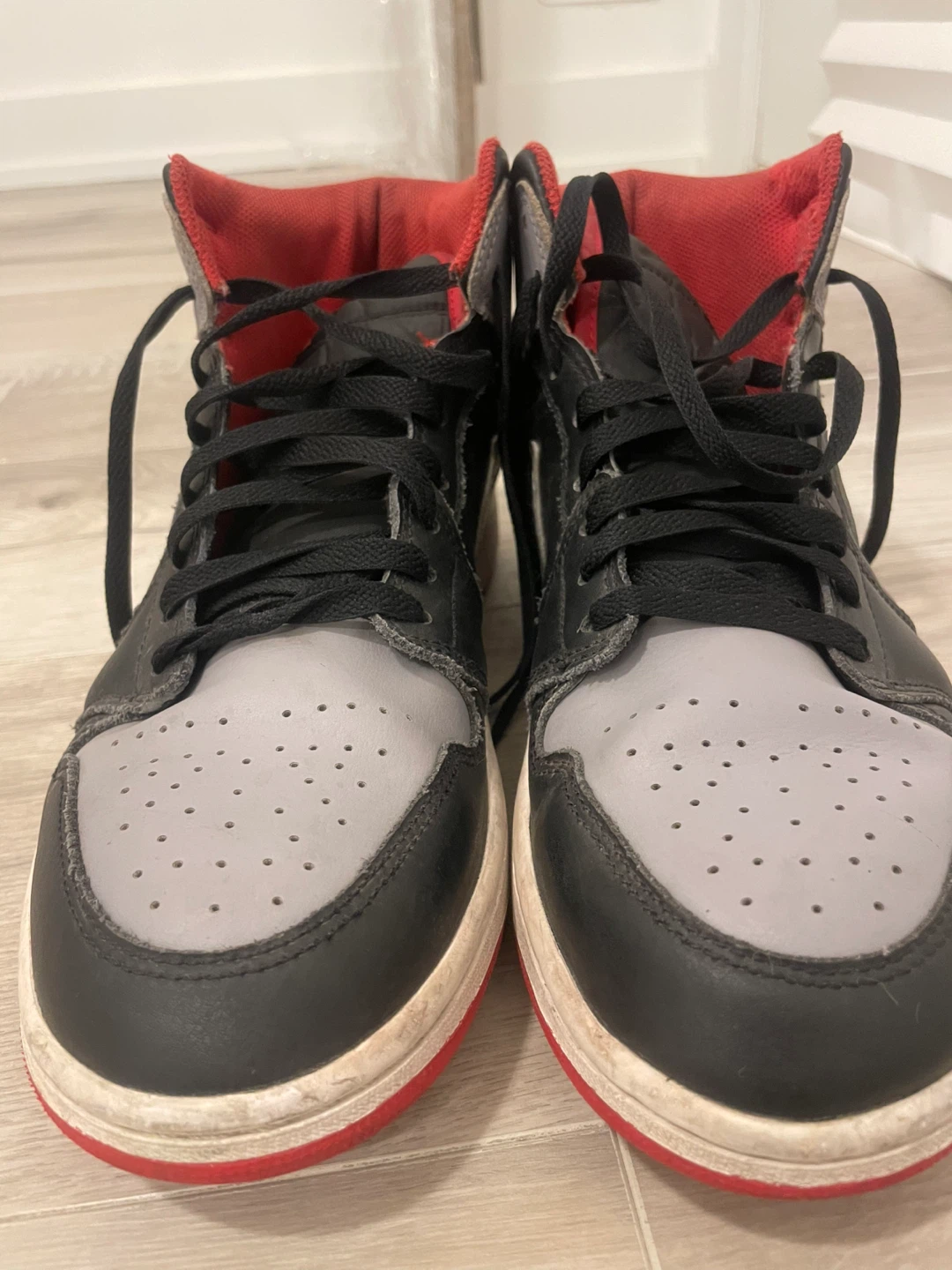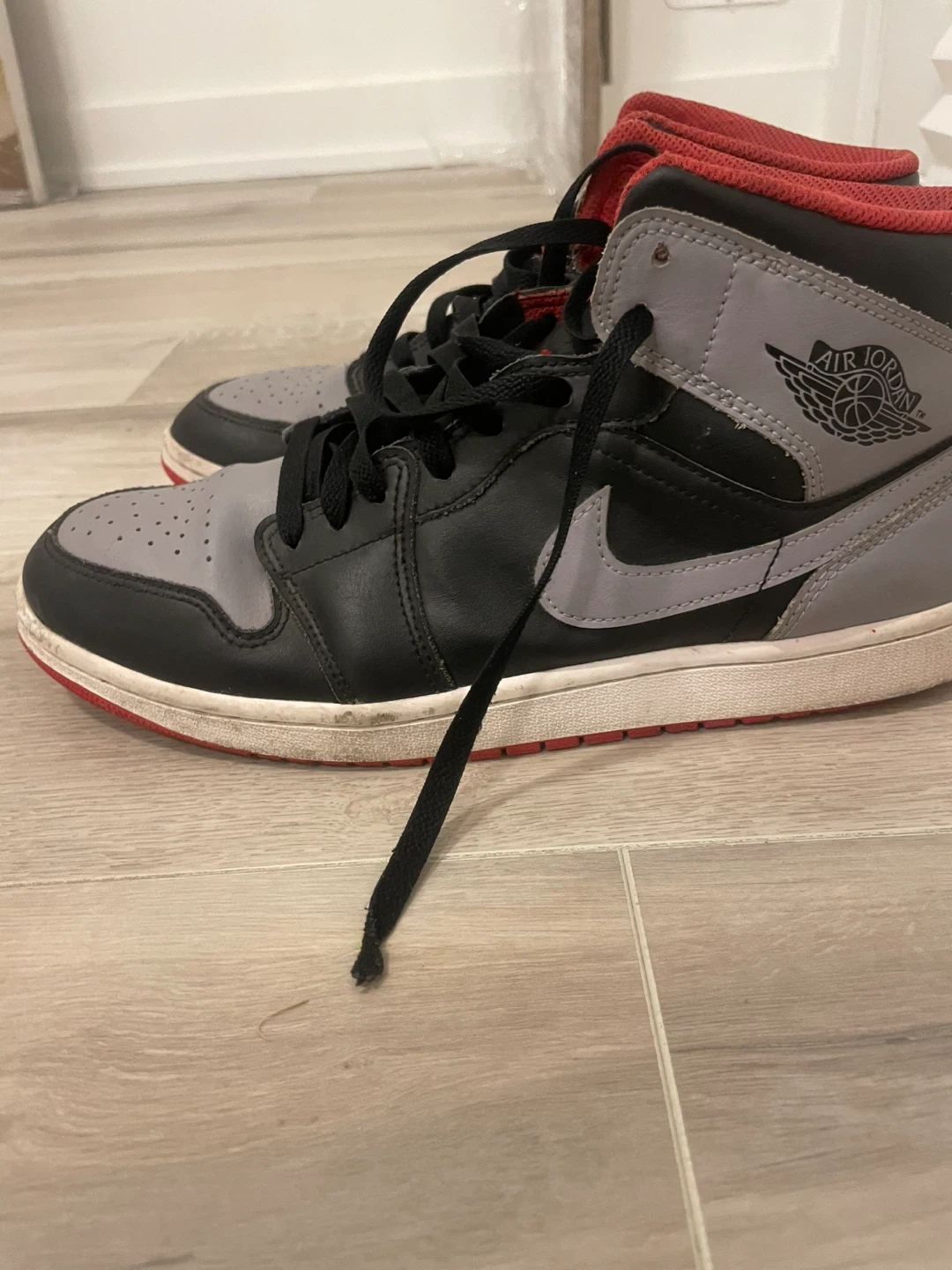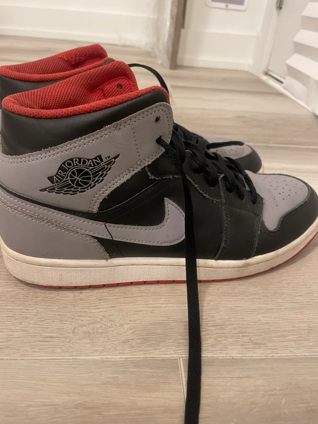 Selling a pair of Air Jordan 1 Mid sneakers in a Shadow Red colourway. These are in used condition, as you can see from the photos. They are a stylish addition to any sneaker collection!