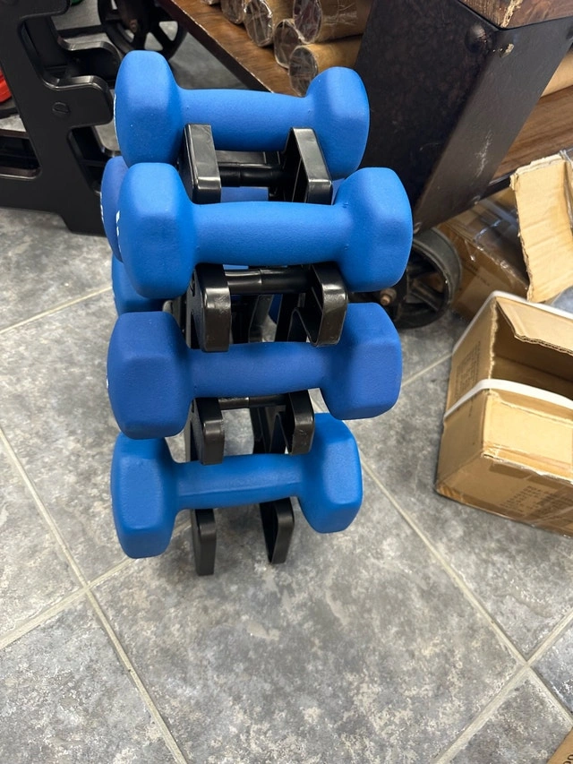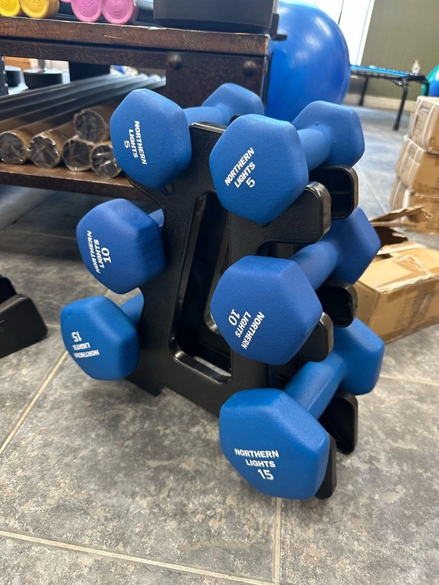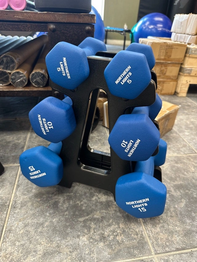 Upgrade your workouts at home with this Northern Lights dumbbell set + rack. Compact, durable, and perfect for strength training or toning. ✅ Includes: