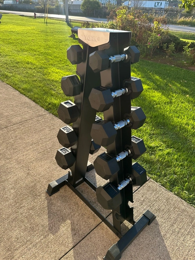 • York Rubber Hex Dumbbell pairs: 5, 10, 15, 20, 25, 30 lbs