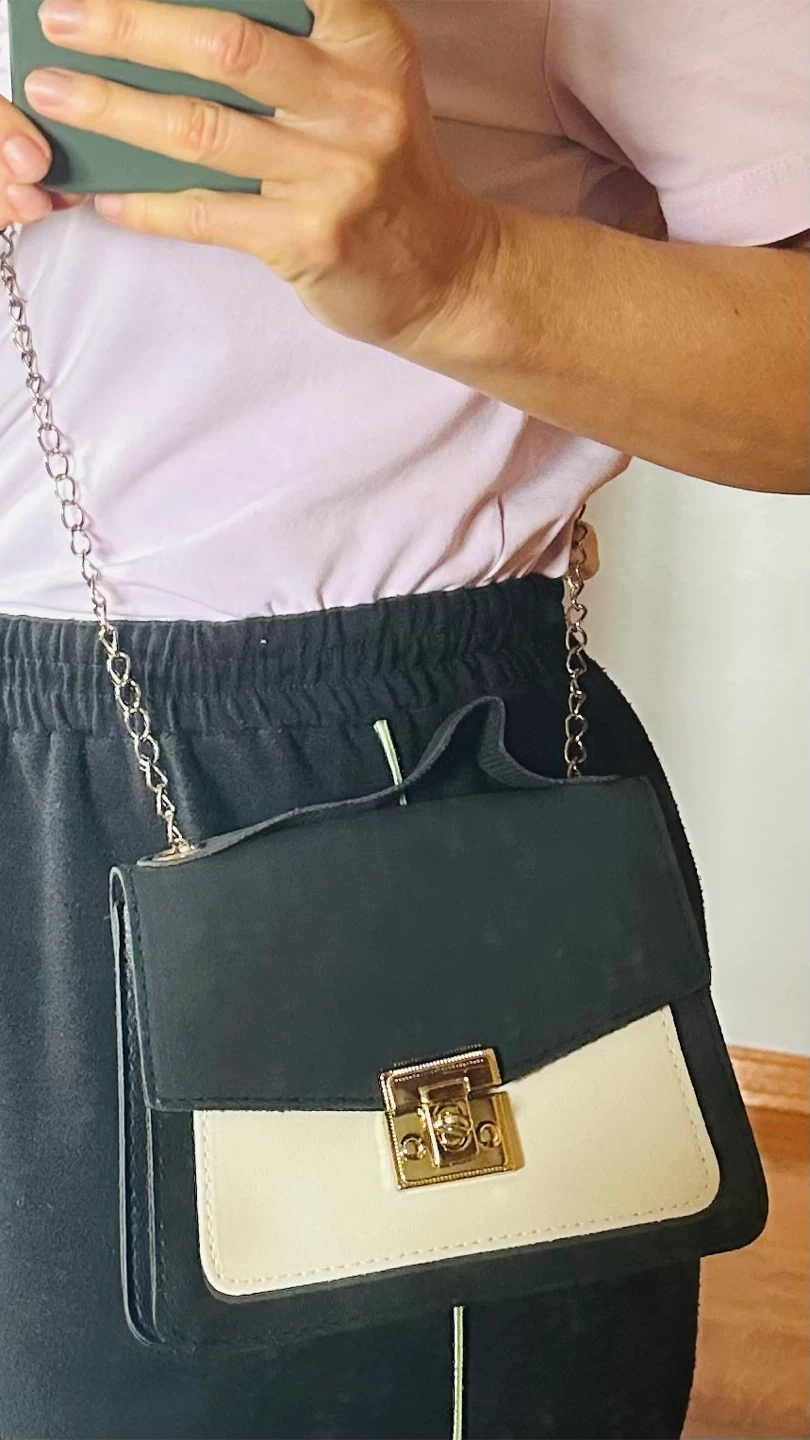 Here's a cute black and cream shoulder bag with a chain strap! It's perfect for adding a touch of style to any outfit. The bag is in great condition and ready for a new owner