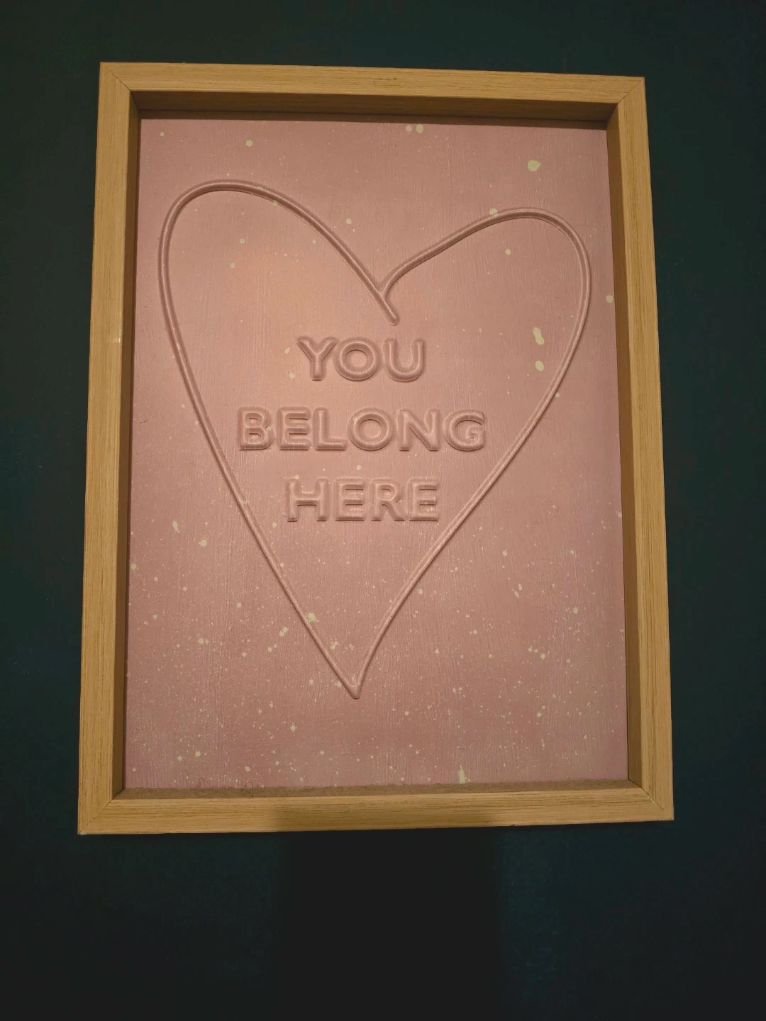 Selling this framed art piece with a heart design and the words 'You Belong Here'. It has a light wood frame and a pink background. It's in great condition and would look lovely in any room