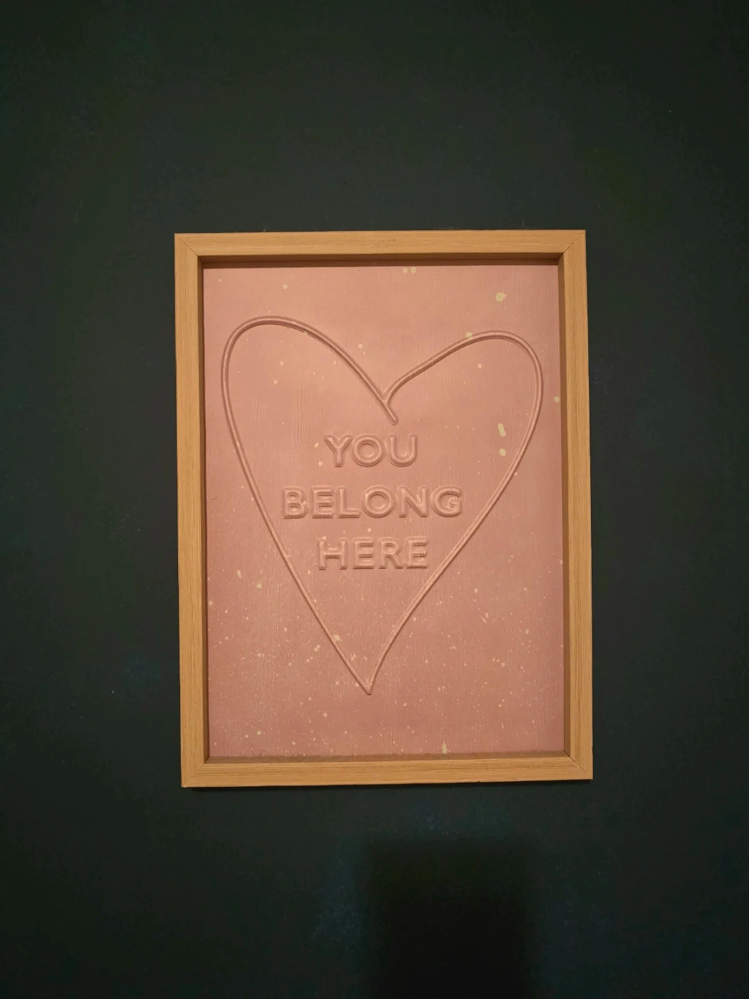 Selling this framed art piece with a heart design and the words 'You Belong Here'. It has a light wood frame and a pink background. It's in great condition and would look lovely in any room