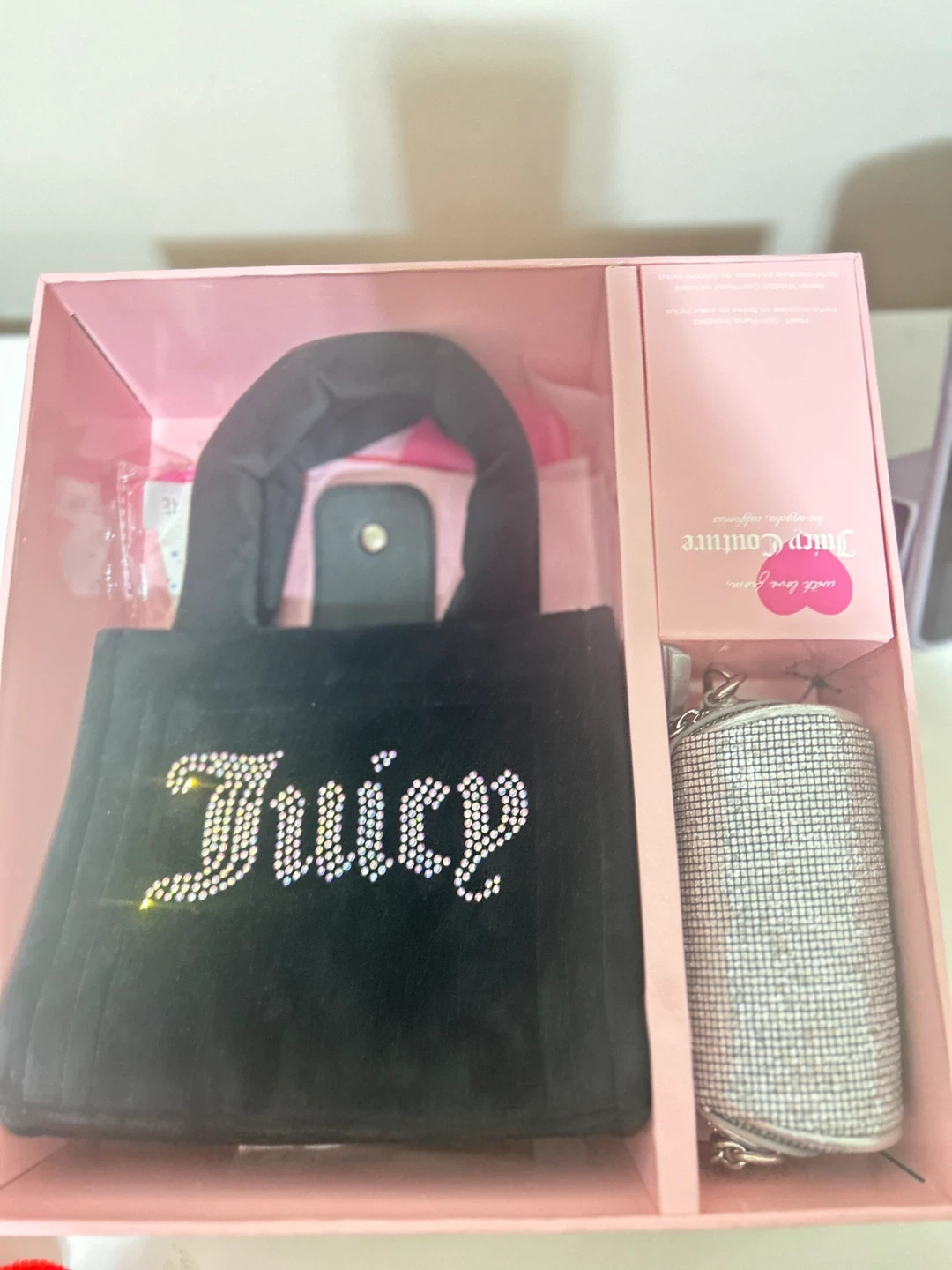 Selling a Juicy Couture mini tote bag set in black! The set includes the mini tote, and other accessories, all in the original box. Perfect for adding a touch of sparkle to your outfit
