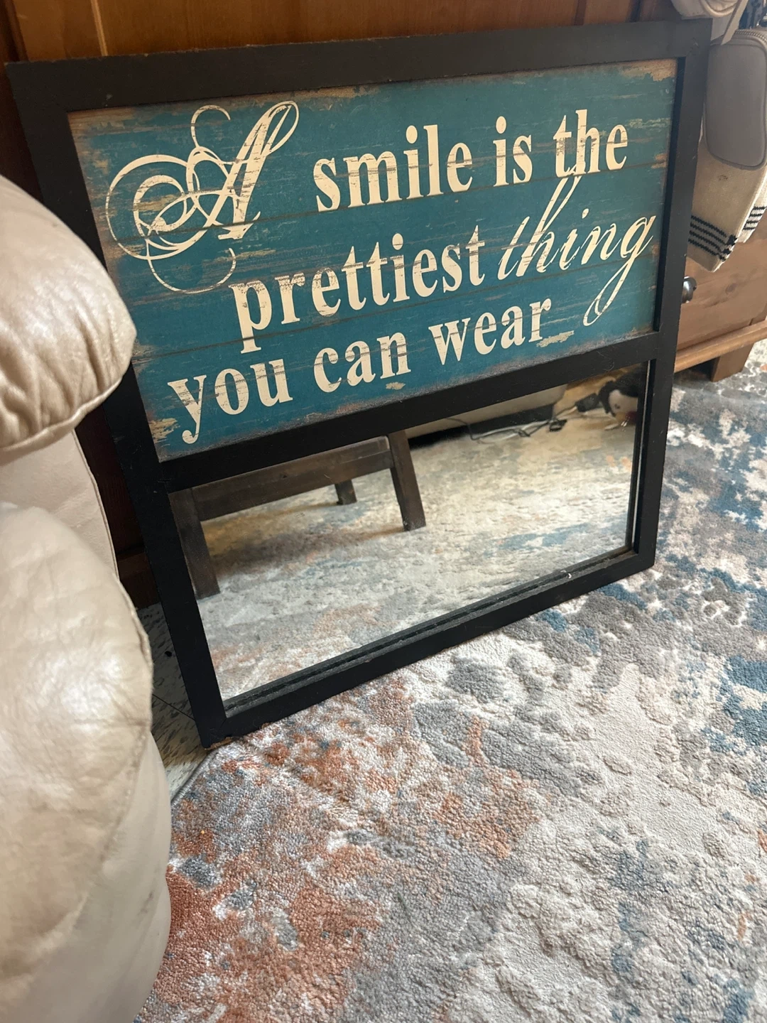A lovely mirror framed with a wooden sign that reads, "A smile is the prettiest thing you can wear"! It's in great condition and ready to brighten up any room