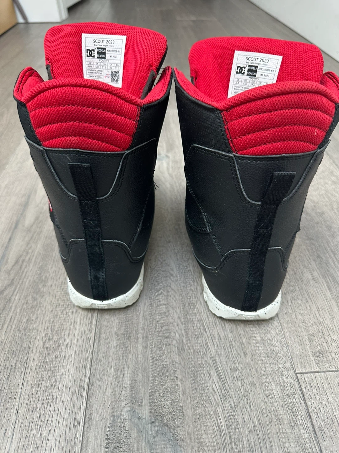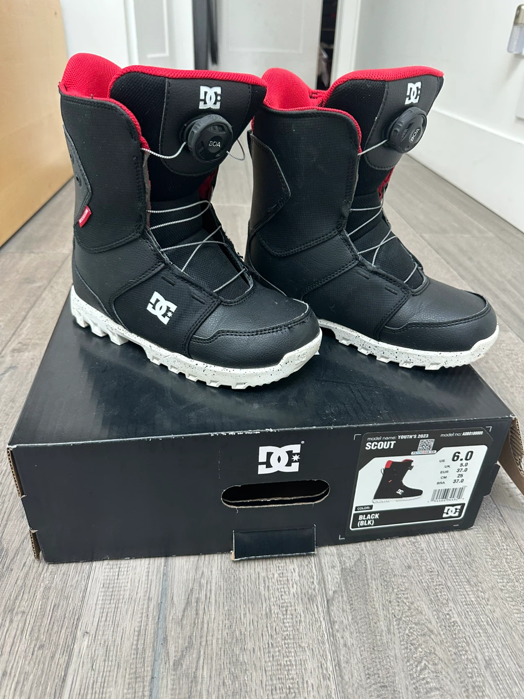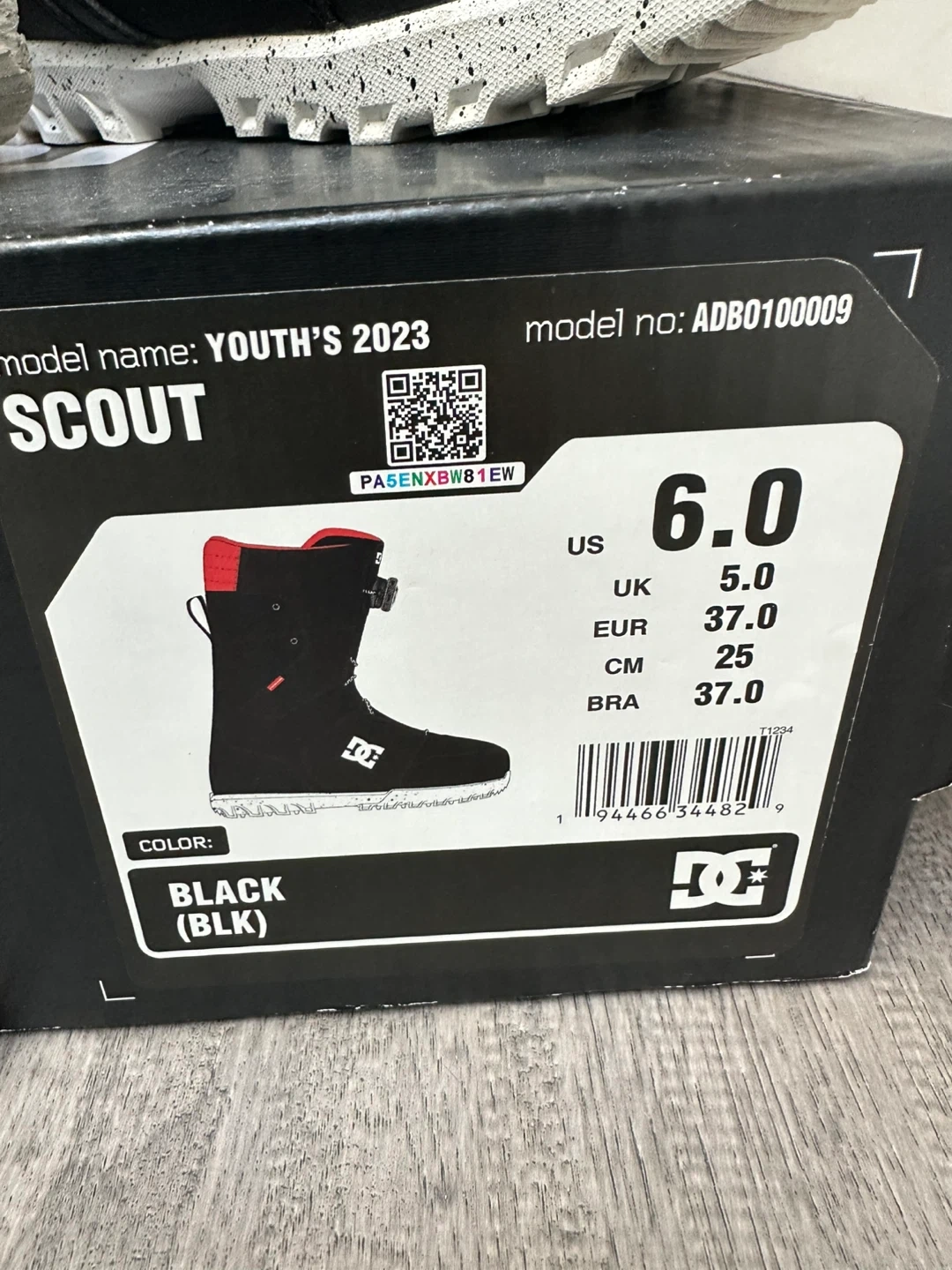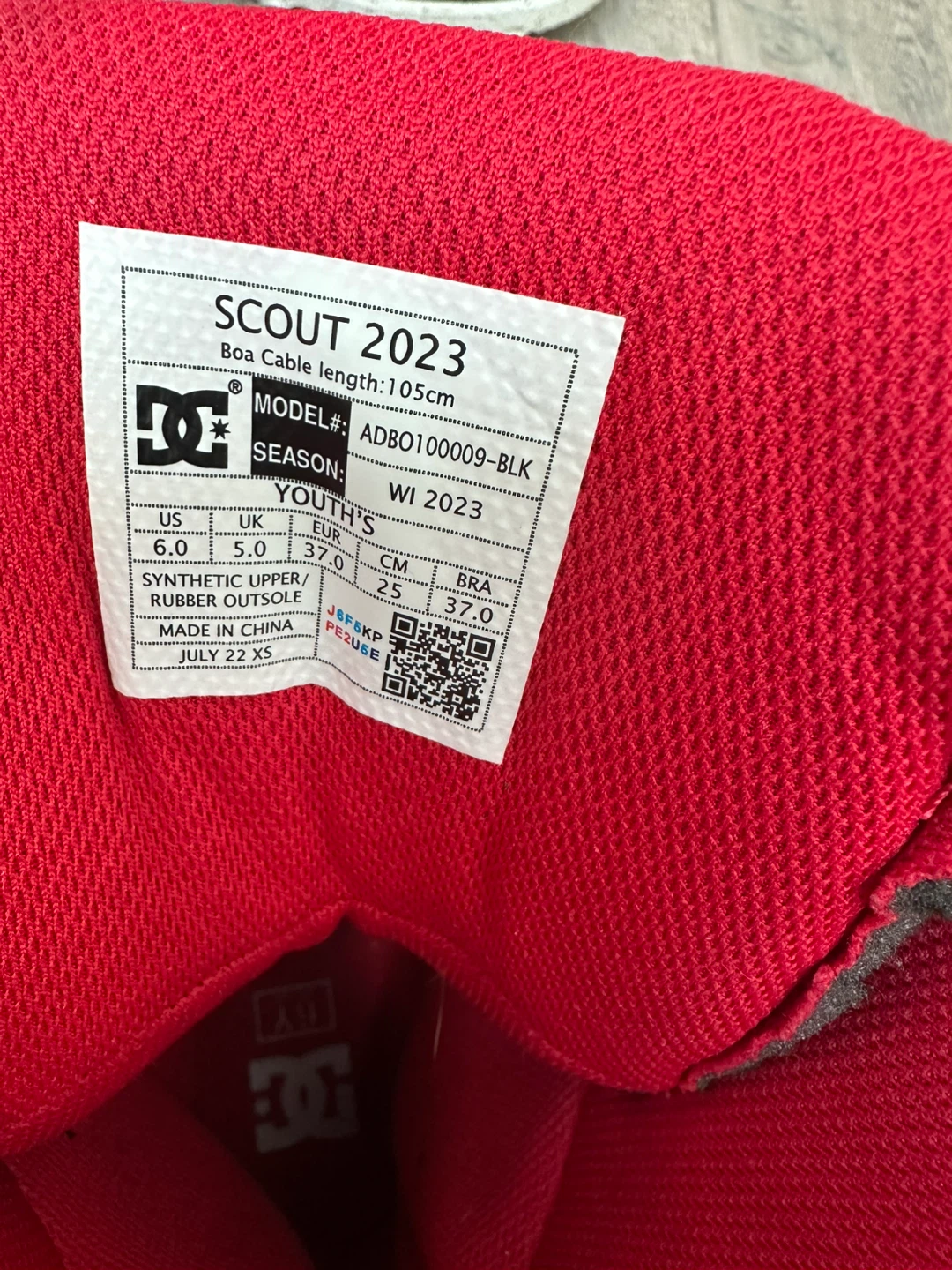 Selling a pair of DC Youth's Scout 2023 snowboard boots. They are black and red and in great condition. The size is US 6.0, UK 5.0, EUR 37.0, CM 25.0, and BRA 35.0. They feature a BOA cable system for easy tightening and loosening. Great for hitting the slopes!