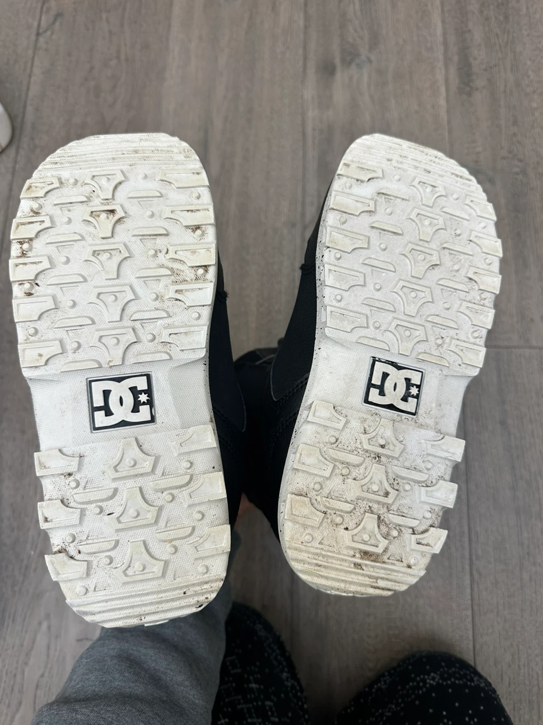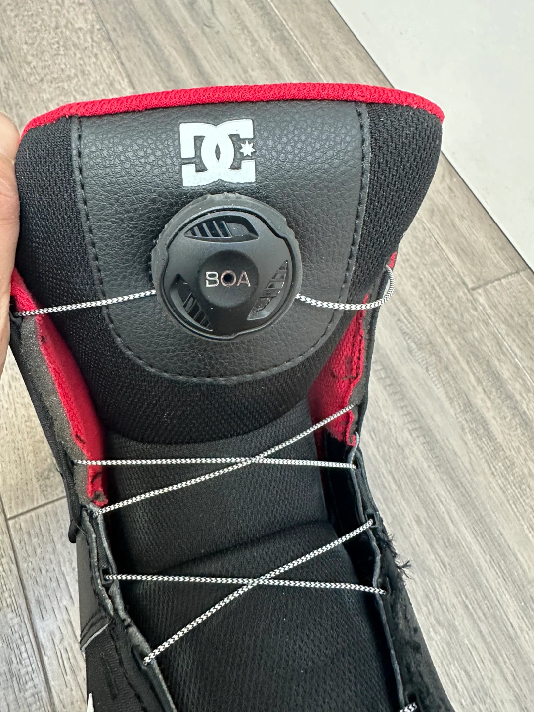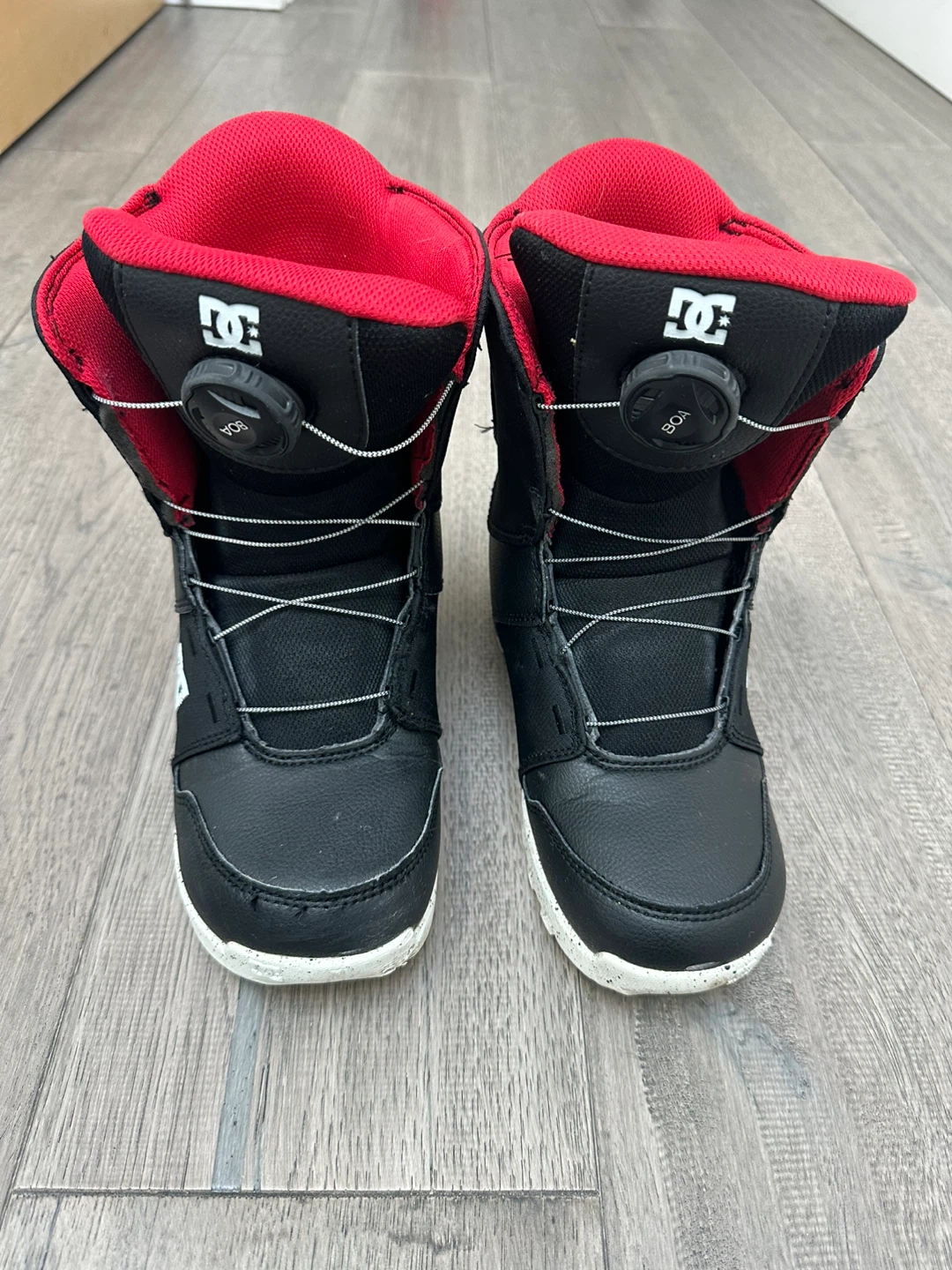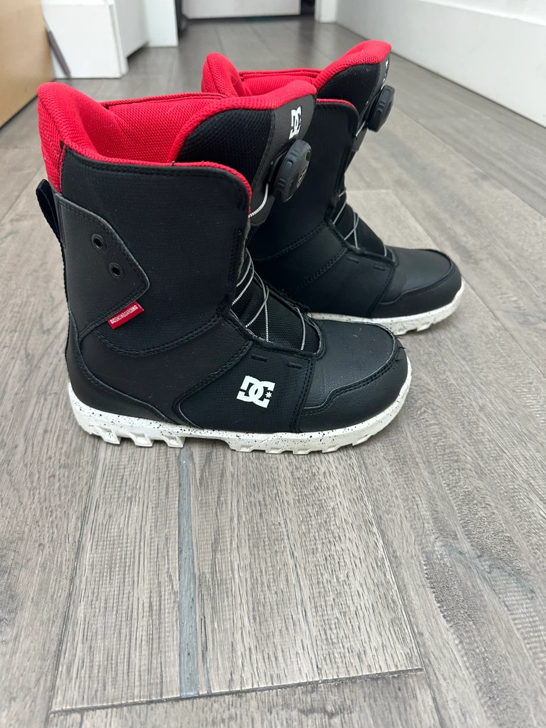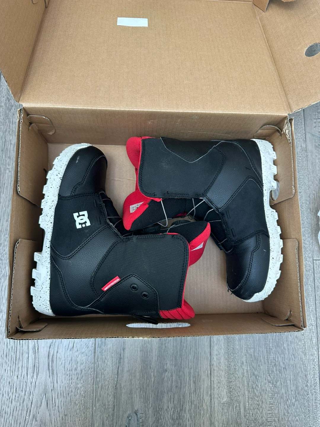 Selling a pair of DC Youth's Scout 2023 snowboard boots. They are black and red and in great condition. The size is US 6.0, UK 5.0, EUR 37.0, CM 25.0, and BRA 35.0. They feature a BOA cable system for easy tightening and loosening. Great for hitting the slopes!