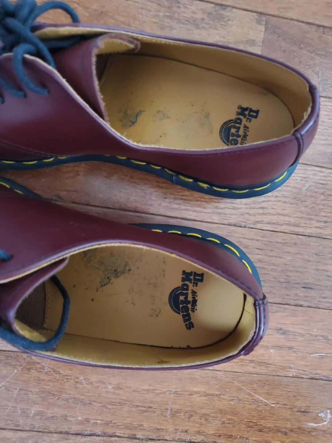Dr. Martens Burgundy Red Leather Heeled Oxfords with Yellow Lace
