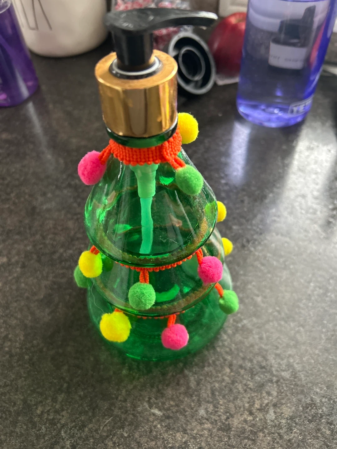 I'm selling a festive Christmas tree-shaped soap dispenser! It's green and decorated with colourful pom poms. Perfect for adding a touch of holiday cheer to your bathroom or kitchen