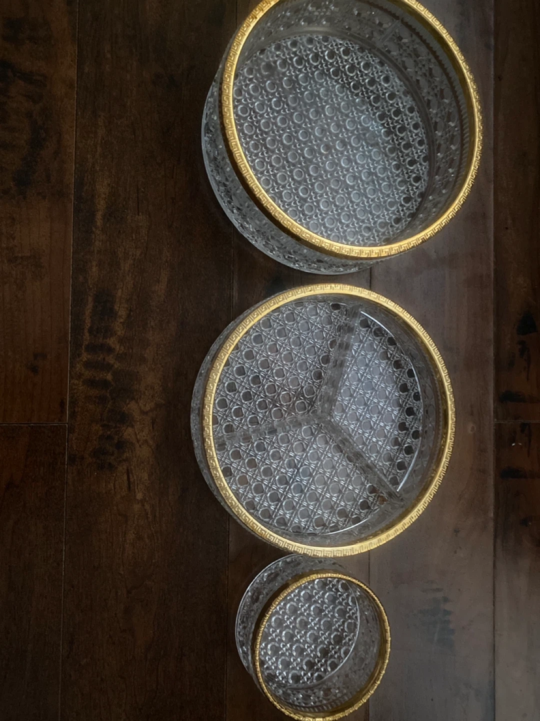 Selling a set of three tiered serving trays. They're made of clear glass with a gold trim, perfect for displaying desserts or appetizers. The different sizes make them versatile for any occasion!