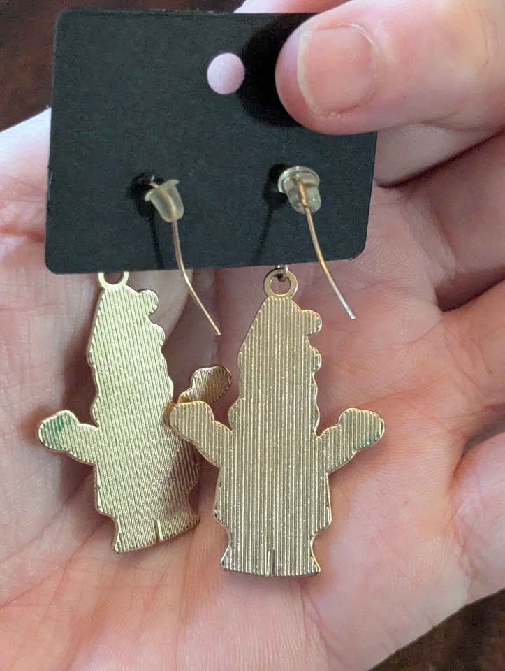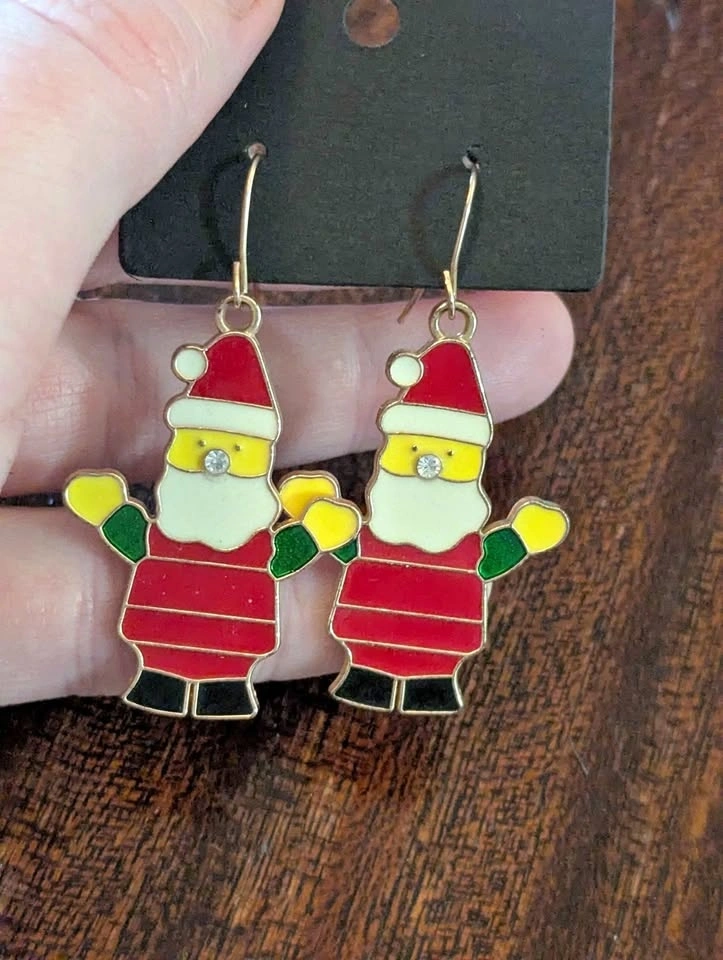 Get into the holiday spirit with these festive dangle earrings featuring Santa Claus figures.