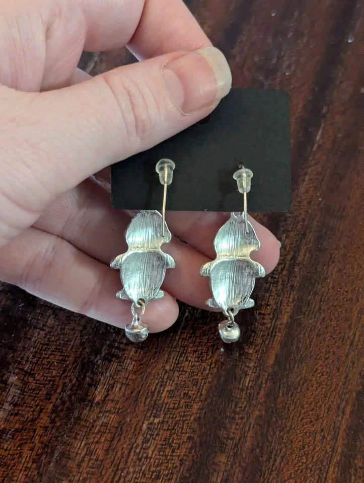 Material: Silver-toned metal, enamel, rhinestones, stainless steel ear hooks