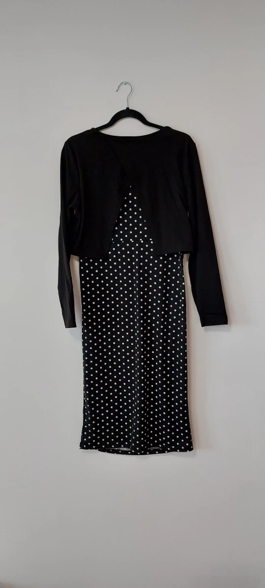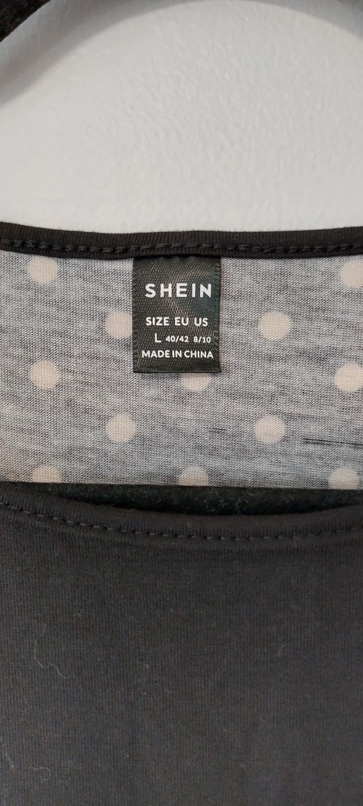 Selling a cute Shein dress with a polka dot pattern! It's black and white and comes in size L. Perfect for a casual outing or a fun event!