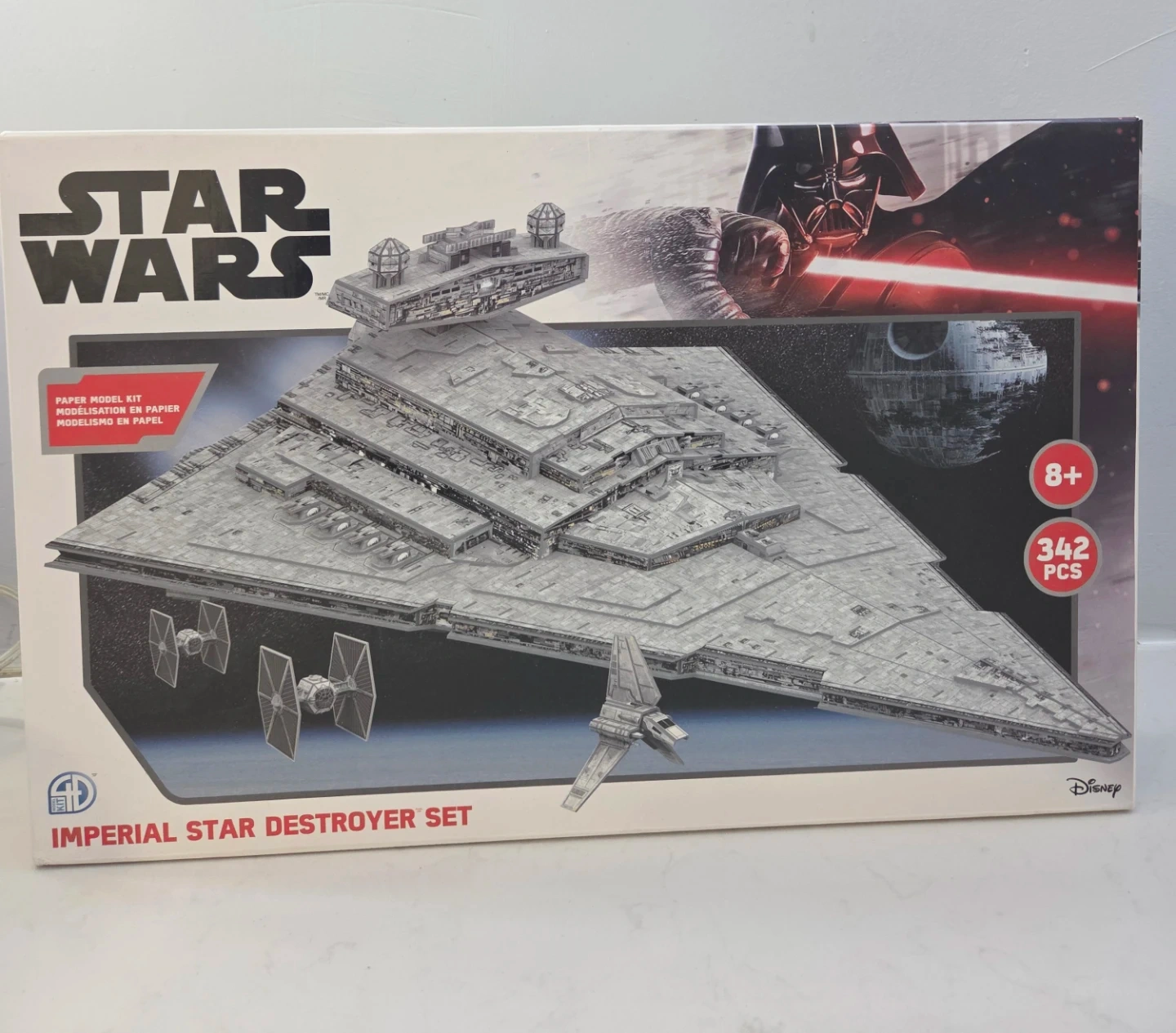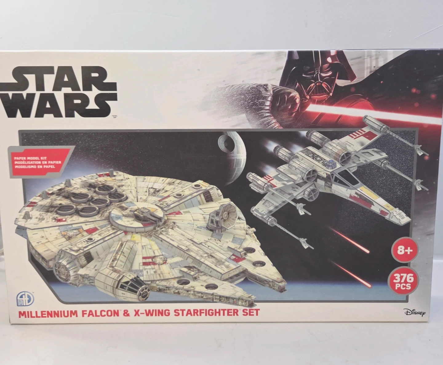 Two boxes of Star Wars paper model kit set. It includes the Millennium Falcon & X-Wing Starfighter set (376 pcs) and the Imperial Star Destroyer set (342 pcs). Both sets are recommended for ages 8+.
