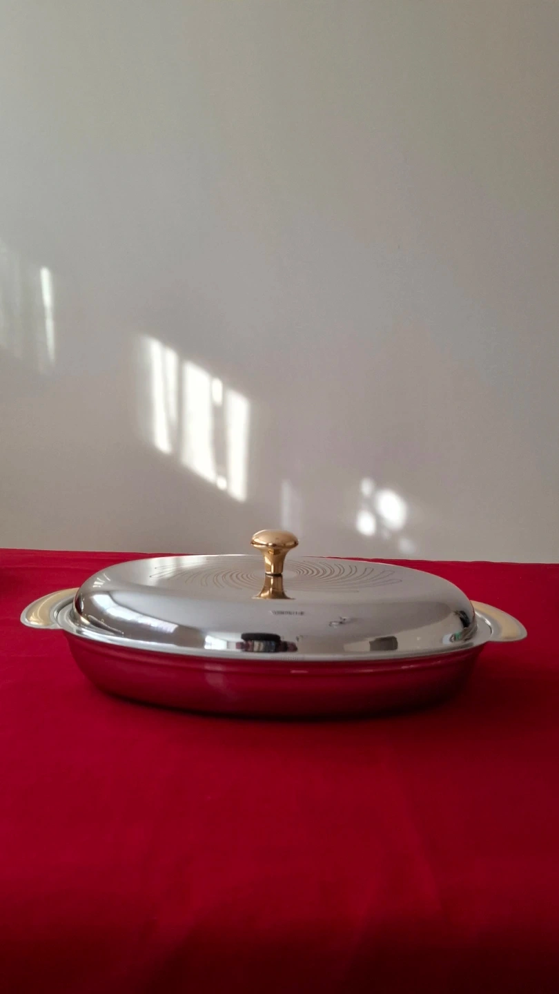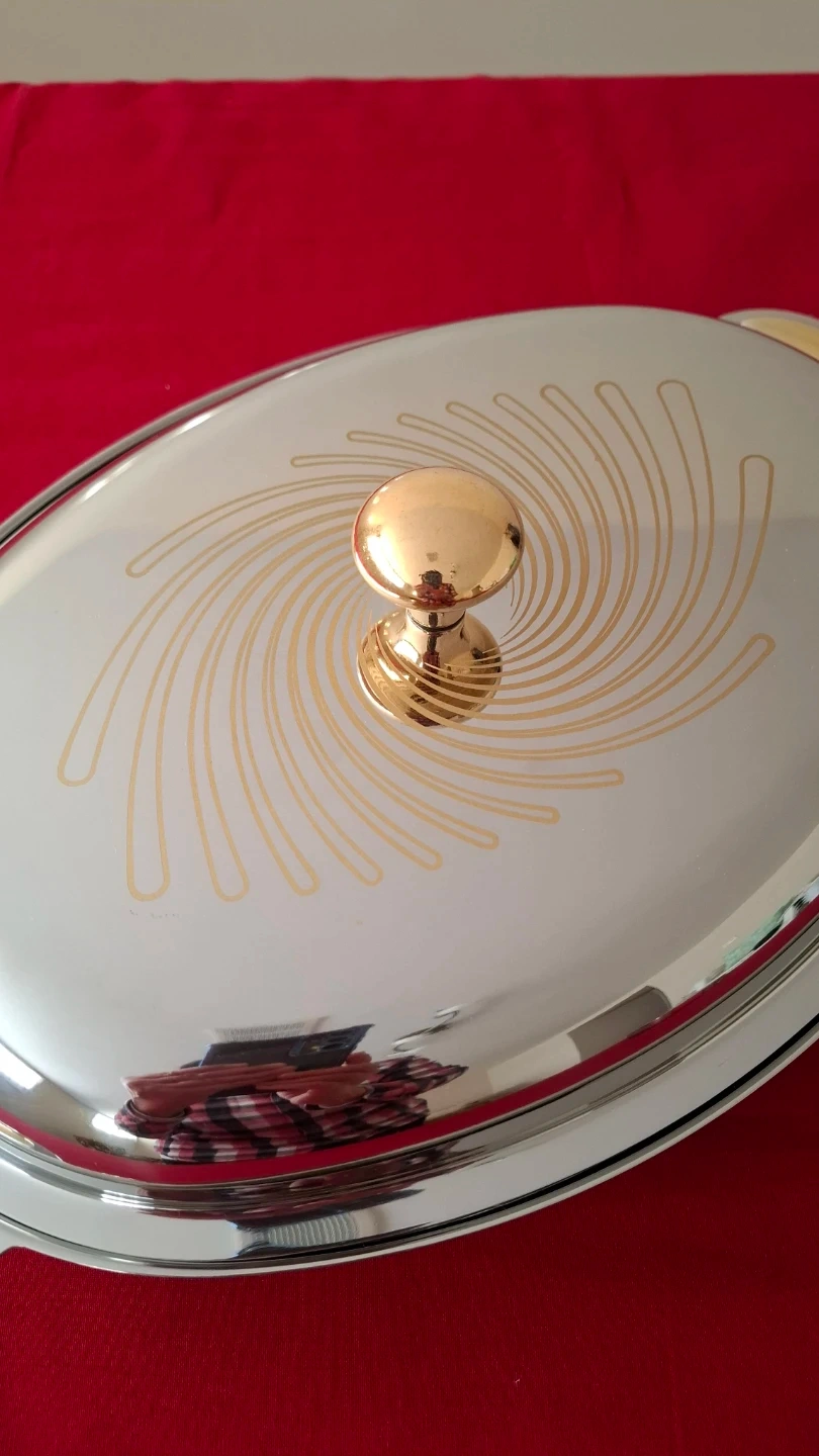 Italian Giorinox 18/10 stainless steel covered serving dish. Features 24kt gold-plated handles and a decorative swirl design. Includes original certificate of guarantee. This is elegant vintage Italian tableware.