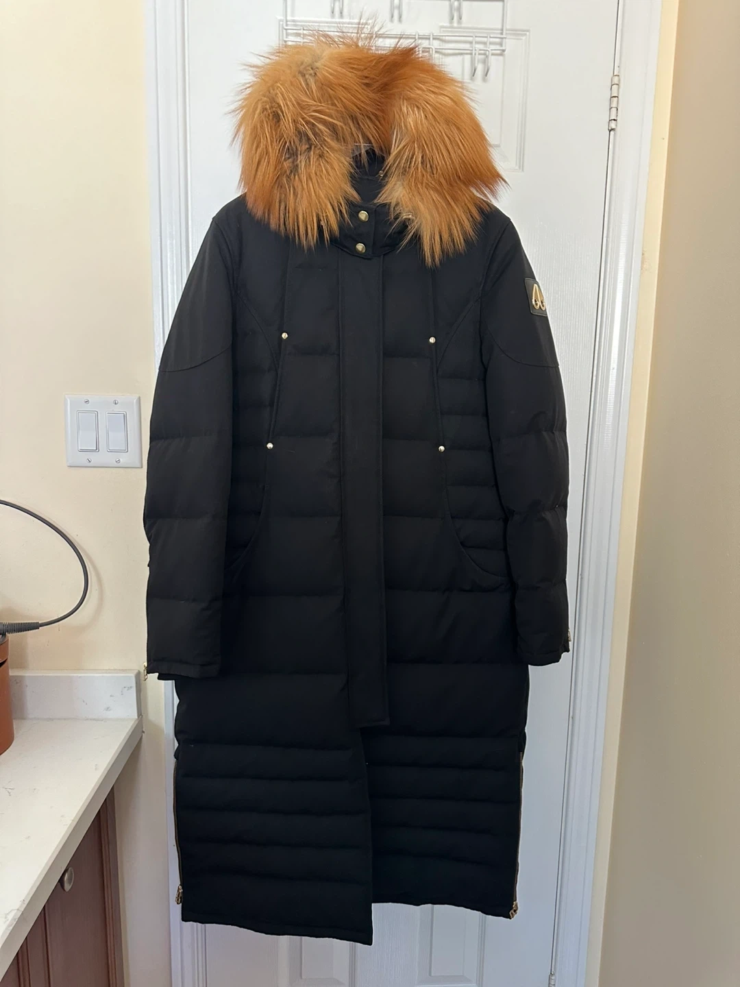 XL size. Selling a Moose Knuckles Gold Stirling Parka with fur trim. It is black in colour and has the Moose Knuckles logo on the sleeve. Originally bought for over $1500+tax.