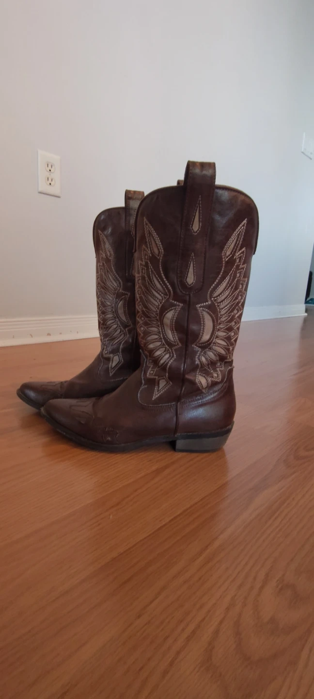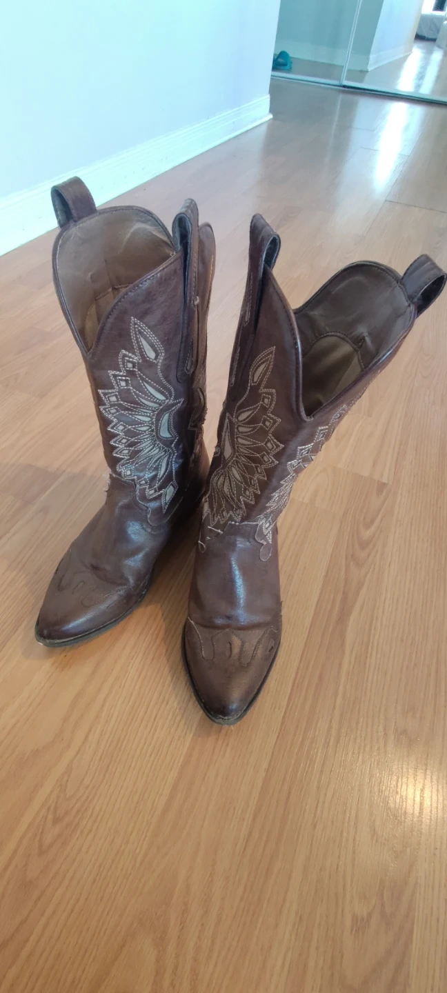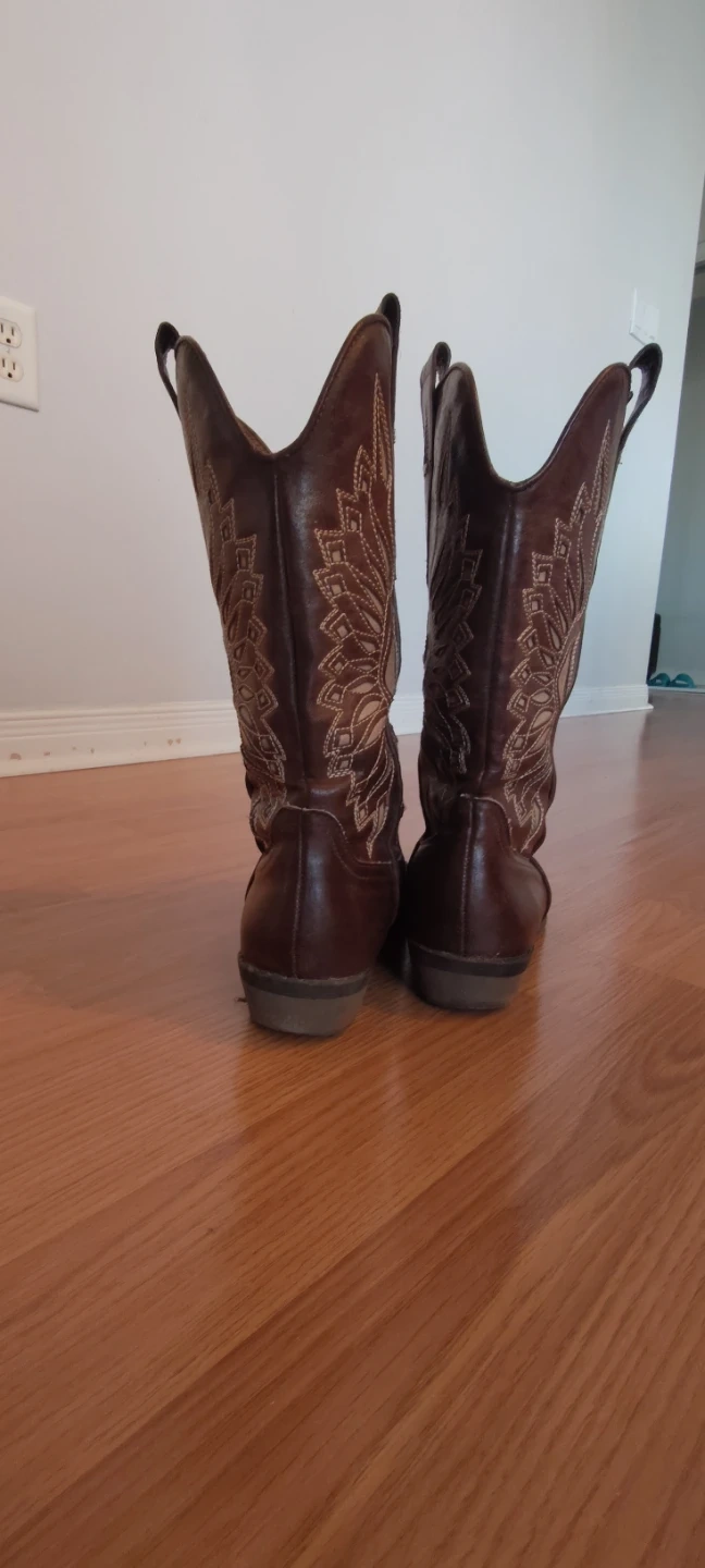 Selling a pair of Bandera cowboy boots in a women's size 7M. They're a stylish brown colour and feature decorative stitching. The upper is textile and the outsole is manmade.