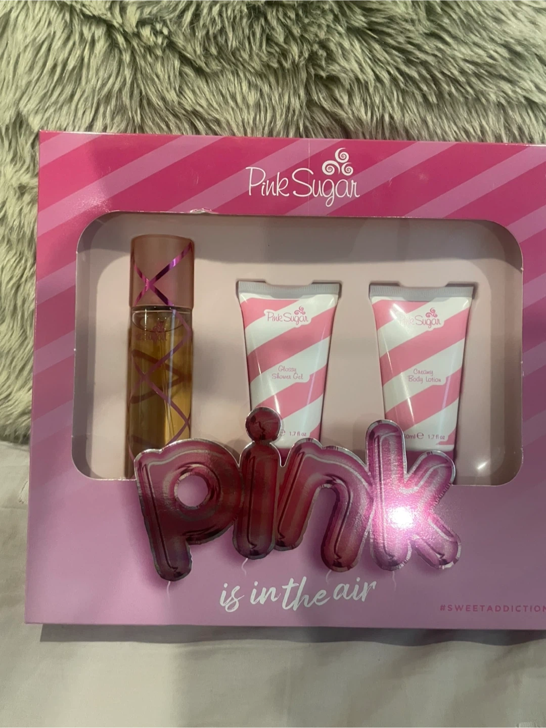 I'm selling a brand new Pink Sugar gift set! It includes a perfume, glossy shower gel, and creamy body lotion. The set comes in its original box, making it a perfect gift!