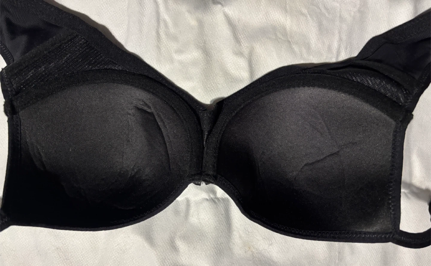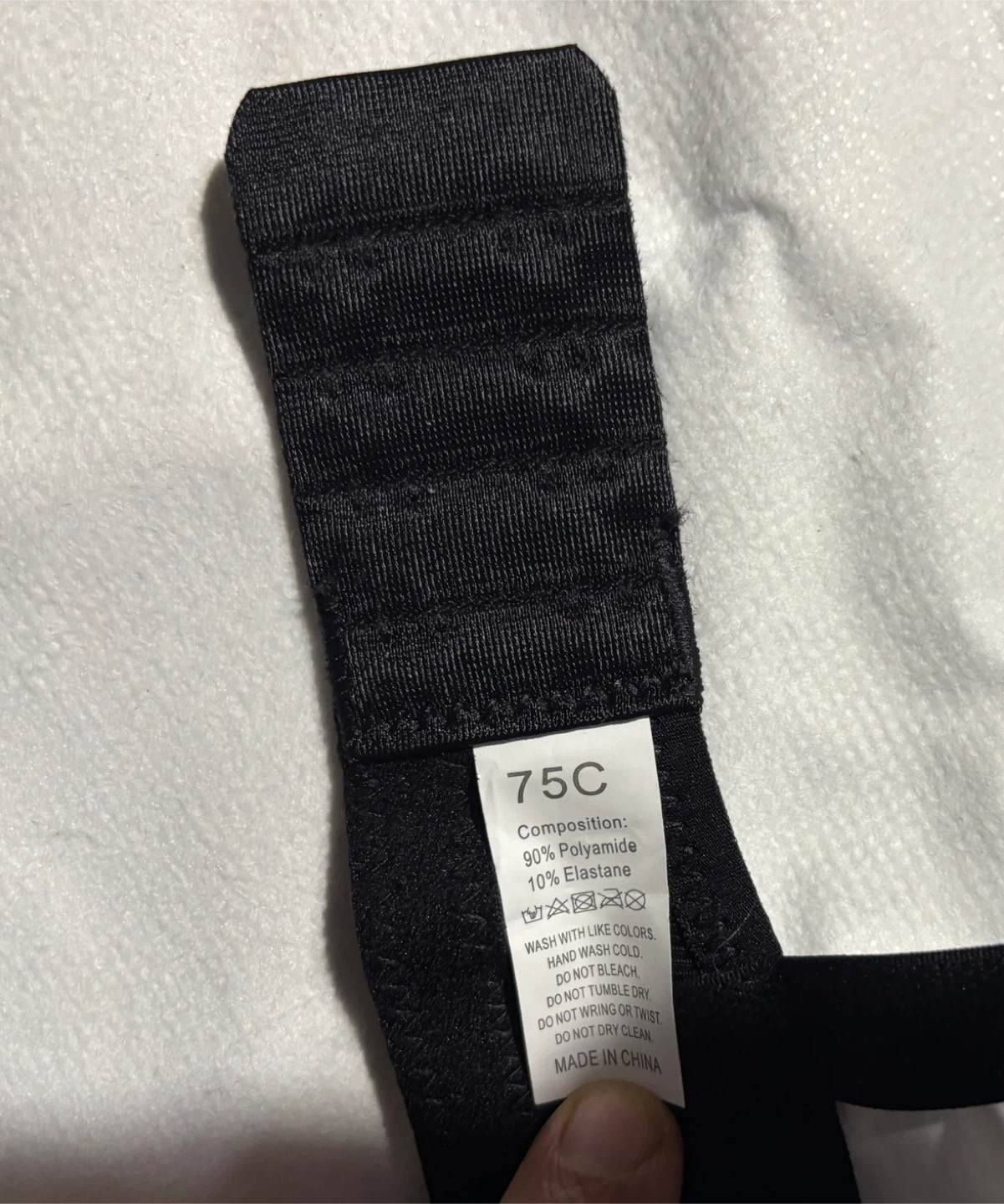 Selling a black bra in size 75C … ie 34C. The bra is made of 90% Polyamide and 10% Elastane.