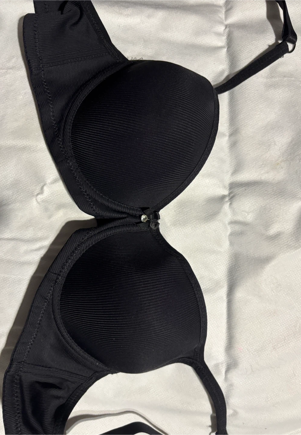 Selling a black bra in size 75C … ie 34C. The bra is made of 90% Polyamide and 10% Elastane.