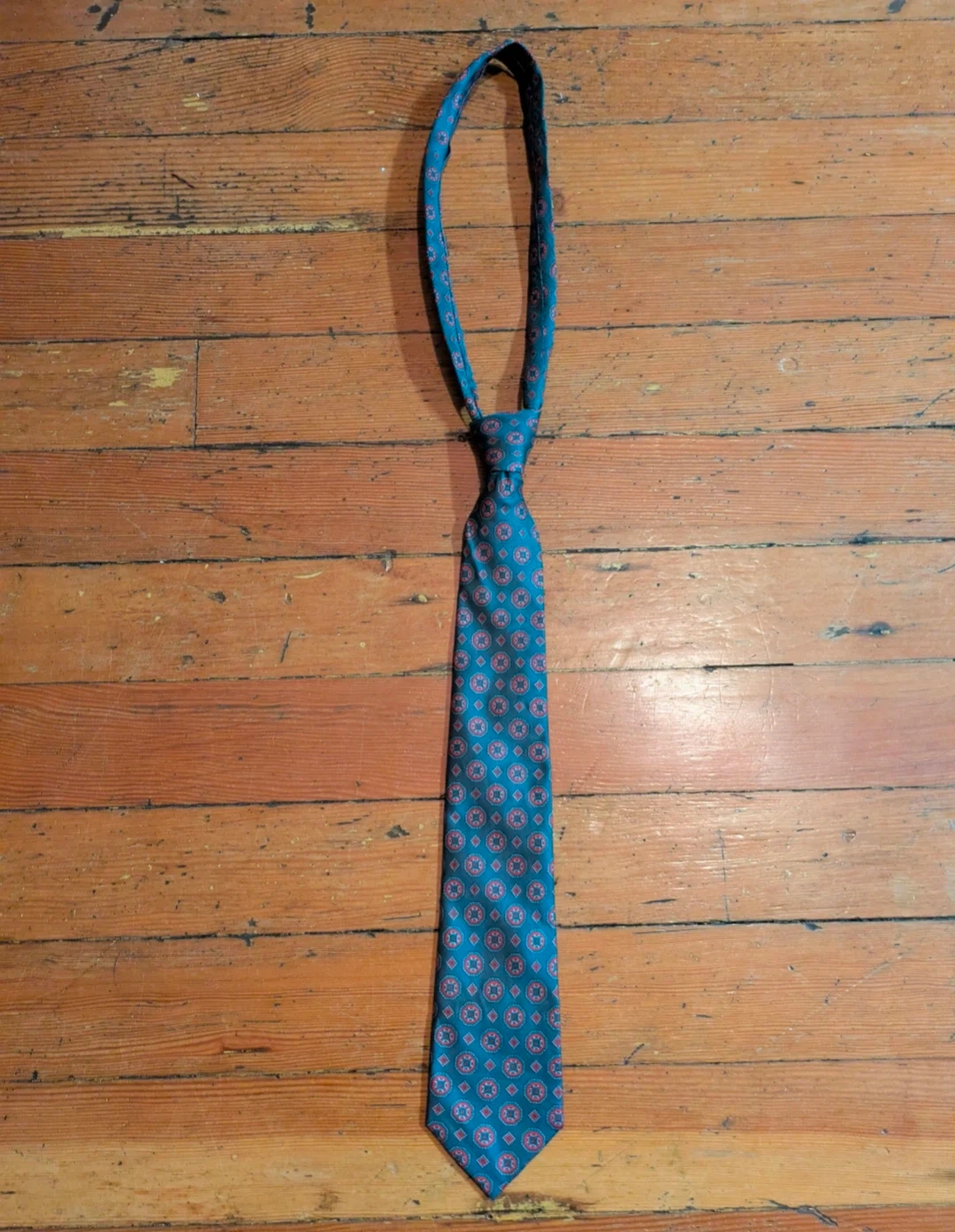 Men's necktie from Moore's. . Grey base colour. Features a repeating red and green geometric pattern. Made in Italy. Hand finished.