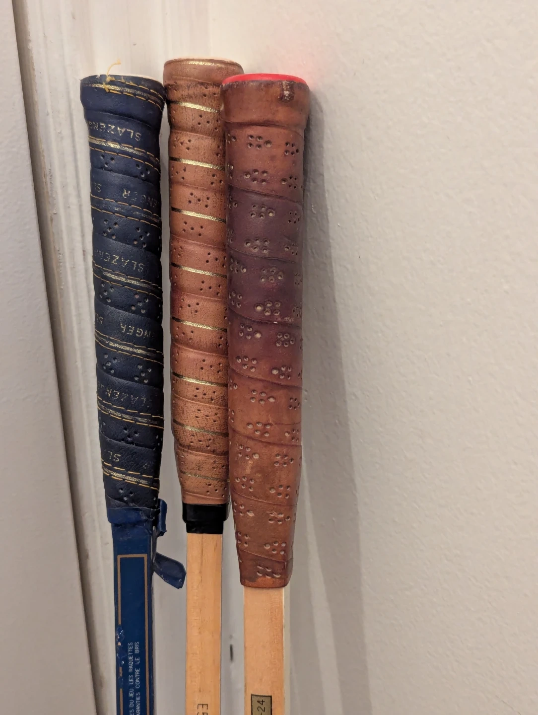Three vintage wooden badminton racquets: Slazinger, Adidas, Kawasaki. Selling as a lot. Unique décor for the vintage collector in your life but still great for recreational use too!