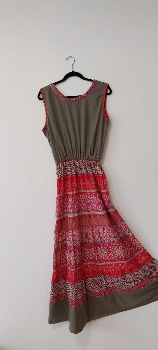Selling a cute patterned maxi dress! It features a sleeveless design with a red and pink patterned skirt and a solid green top. Perfect for summer days!