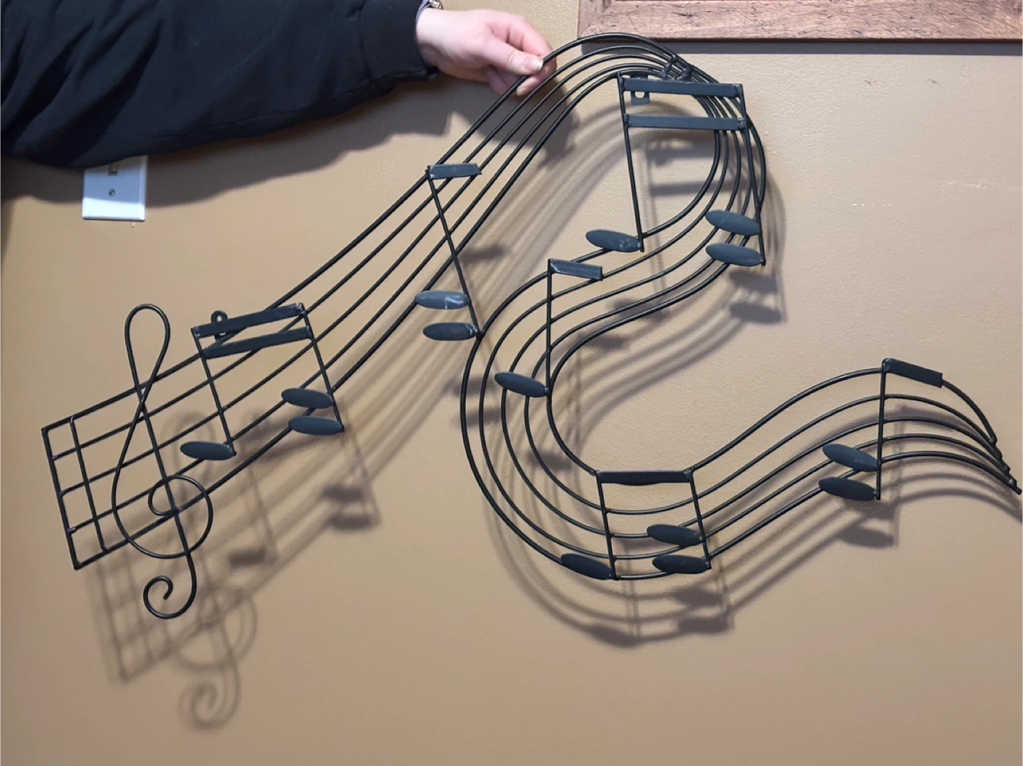 Add a musical touch to your home with this metal music note wall decor! It's a unique piece that's sure to catch the eye and bring a bit of melody to any room. 34” wide, 19” tall (at highest points). Pick up Haysboro SW