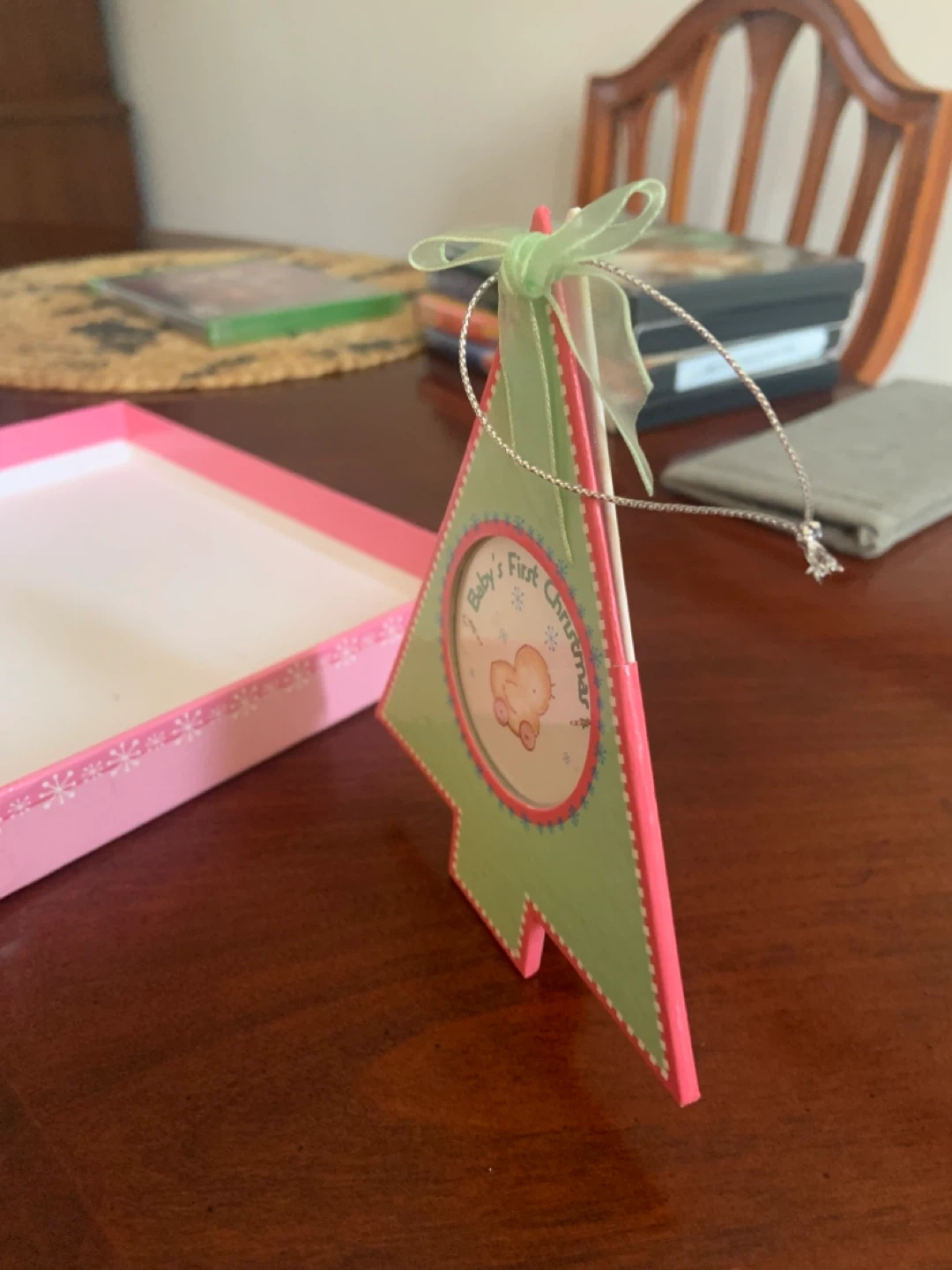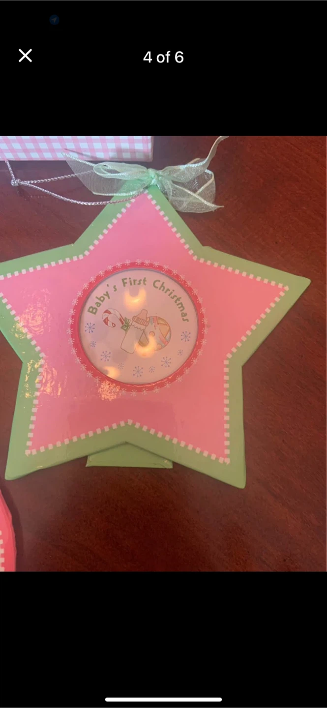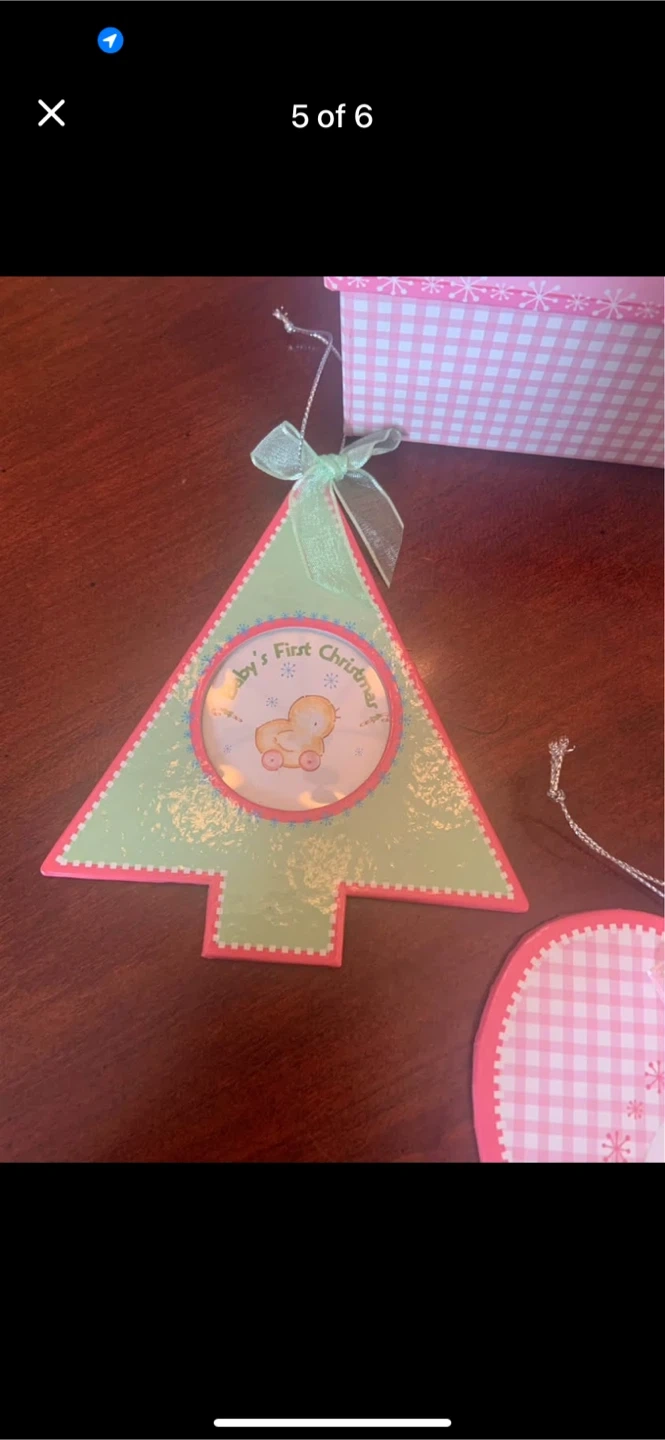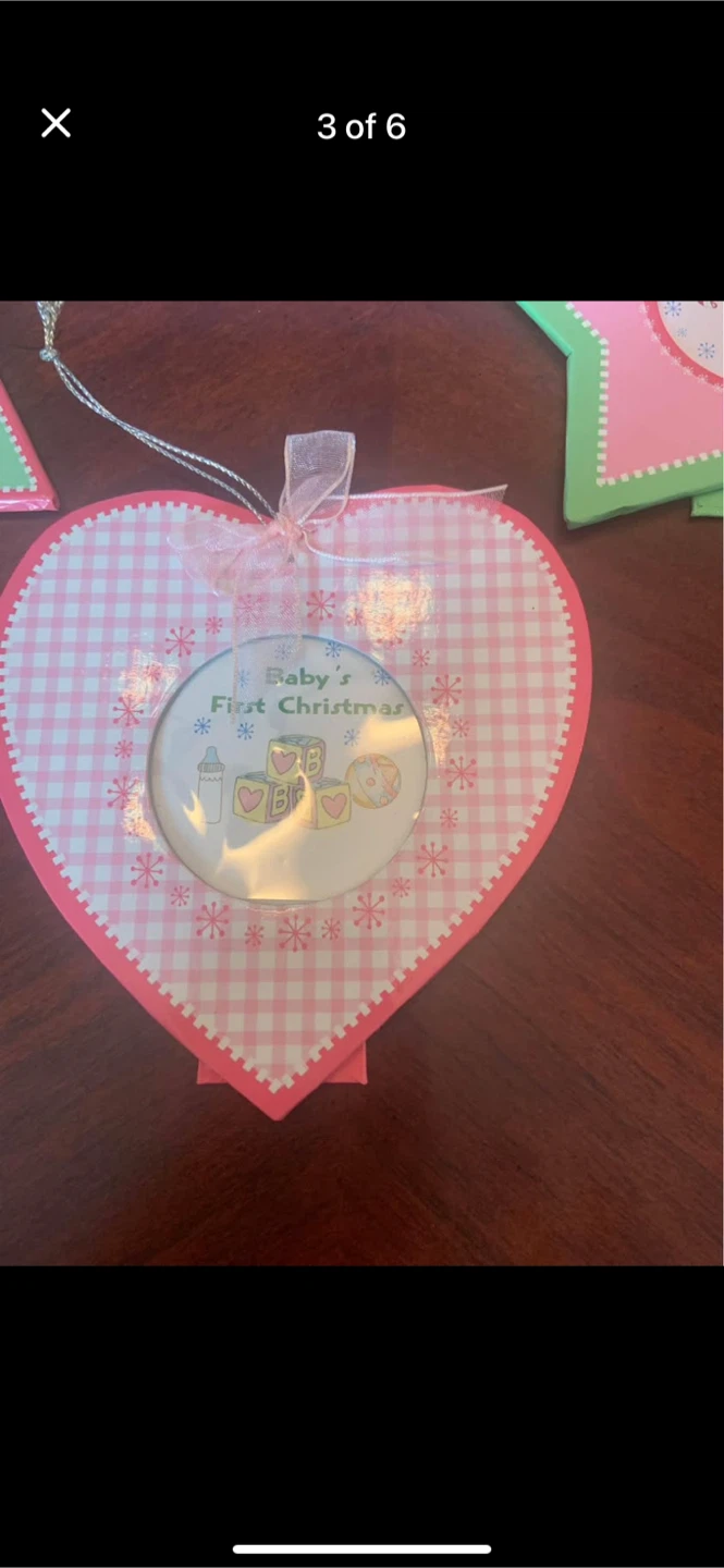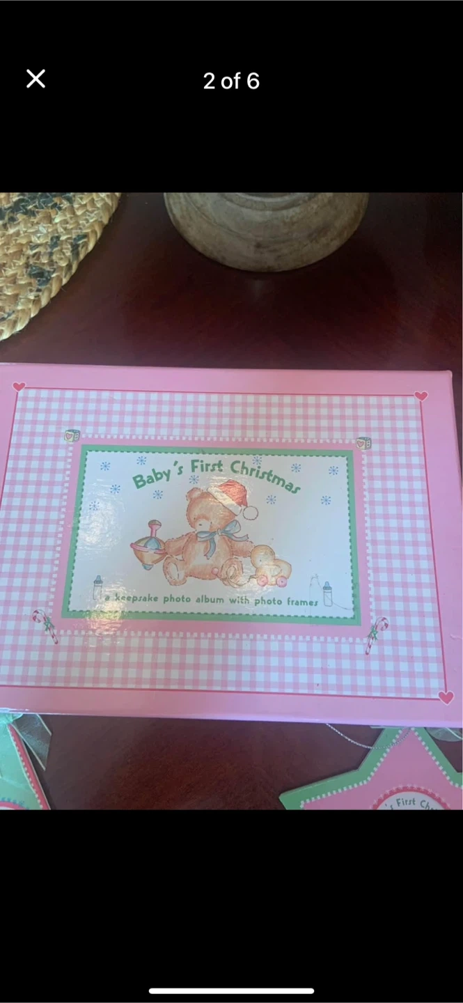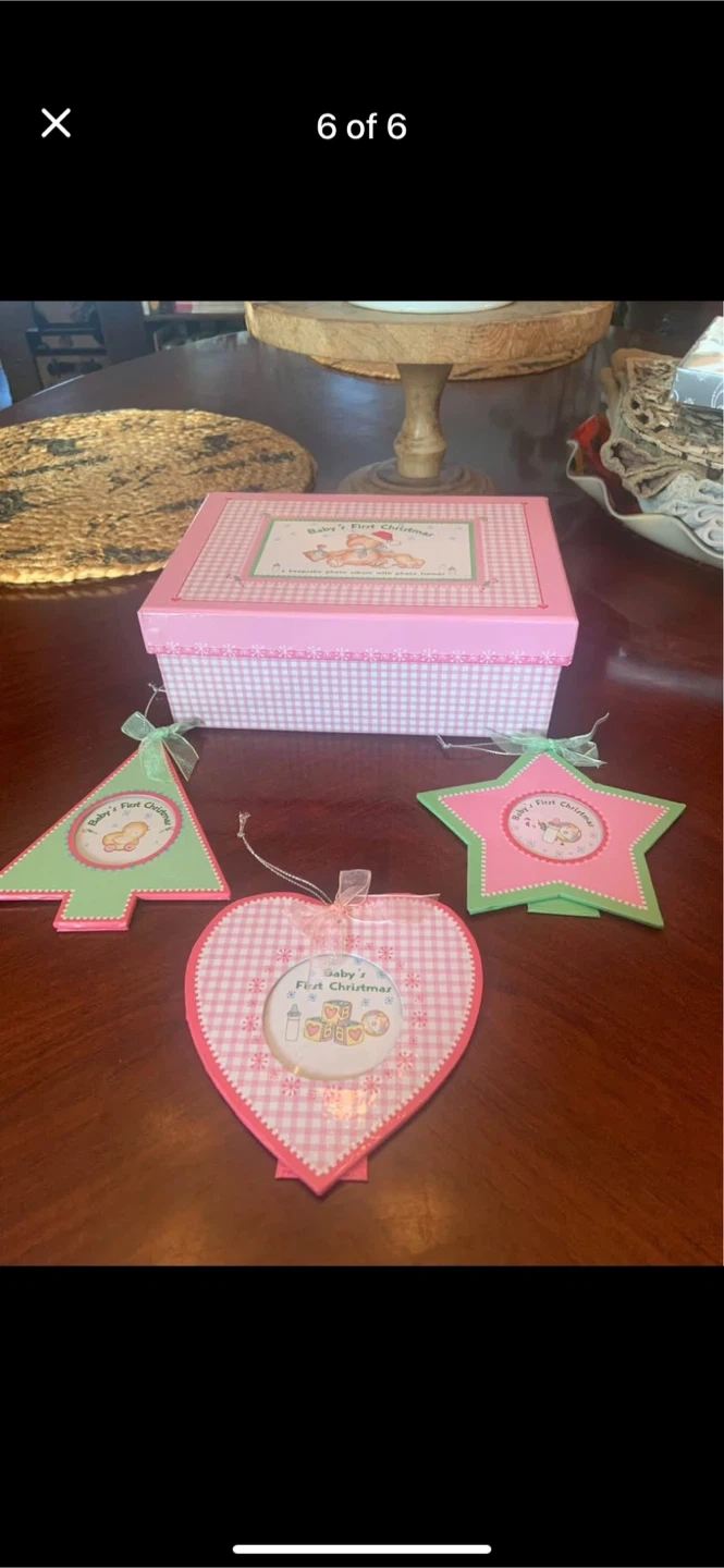 A sweet keepsake for baby's first Christmas! This set includes a photo album and three adorable ornaments: a heart, a star, and a Christmas tree. All are in excellent condition and ready to decorate your home for the holidays