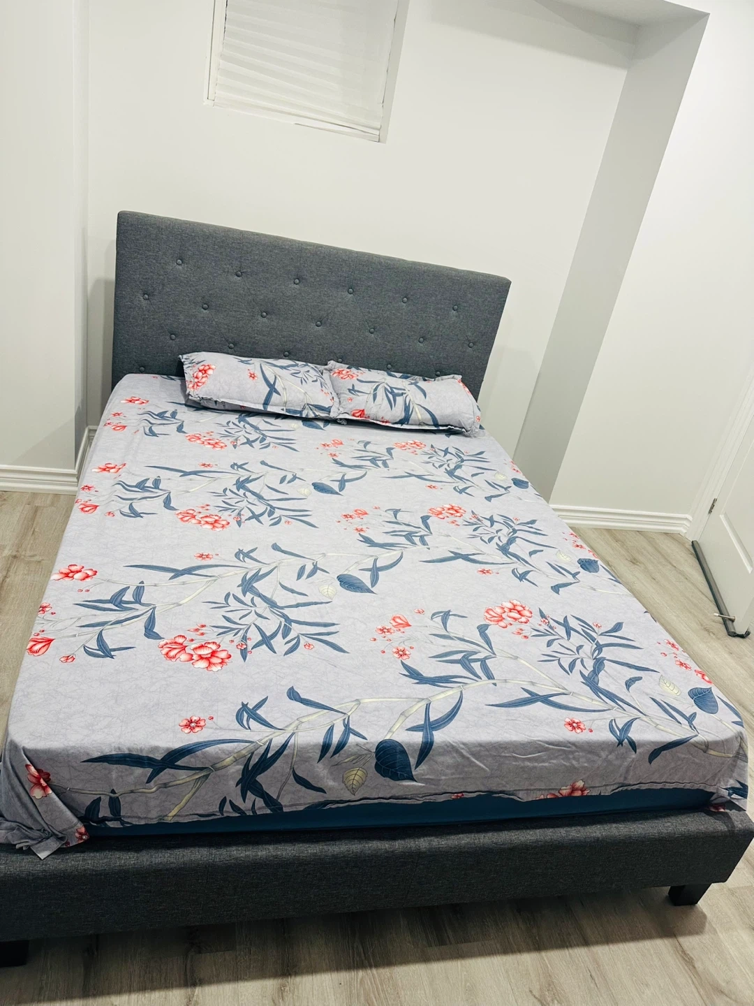 Selling a bed frame featuring a grey upholstered headboard with bamboo mattress. The bed is in good condition and includes the headboard and frame.