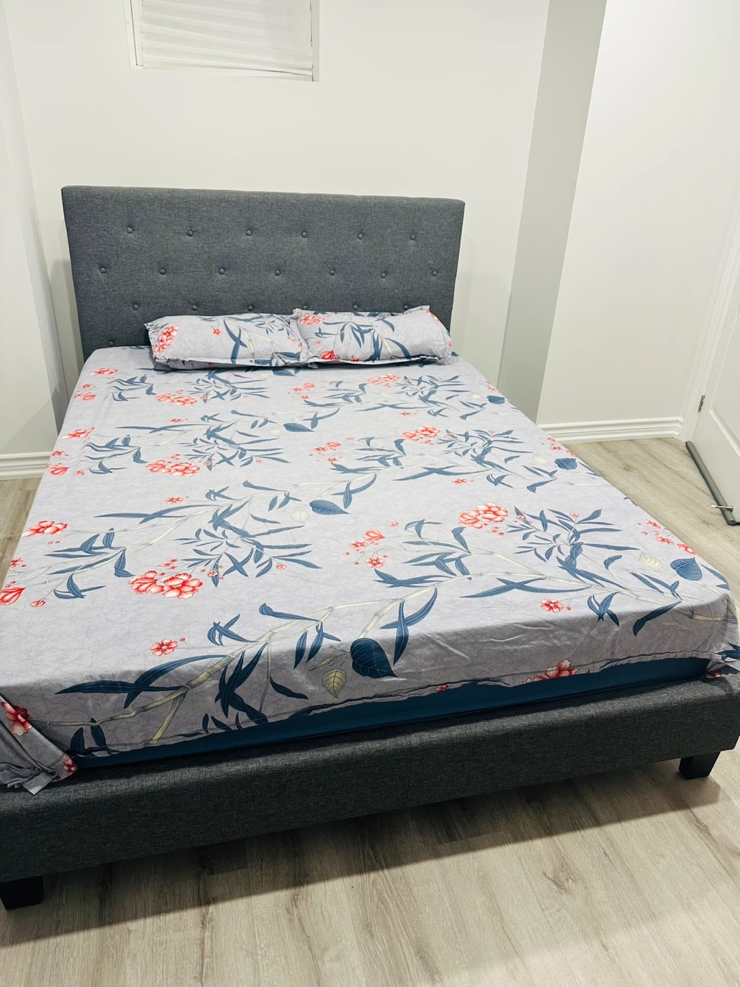 Selling a bed frame featuring a grey upholstered headboard with bamboo mattress. The bed is in good condition and includes the headboard and frame.