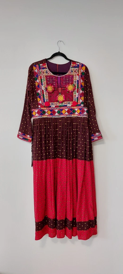 Selling a beautiful dress with intricate embroidery. The dress features a unique design with a mix of colours and patterns. It's in great condition and ready for a new owner!