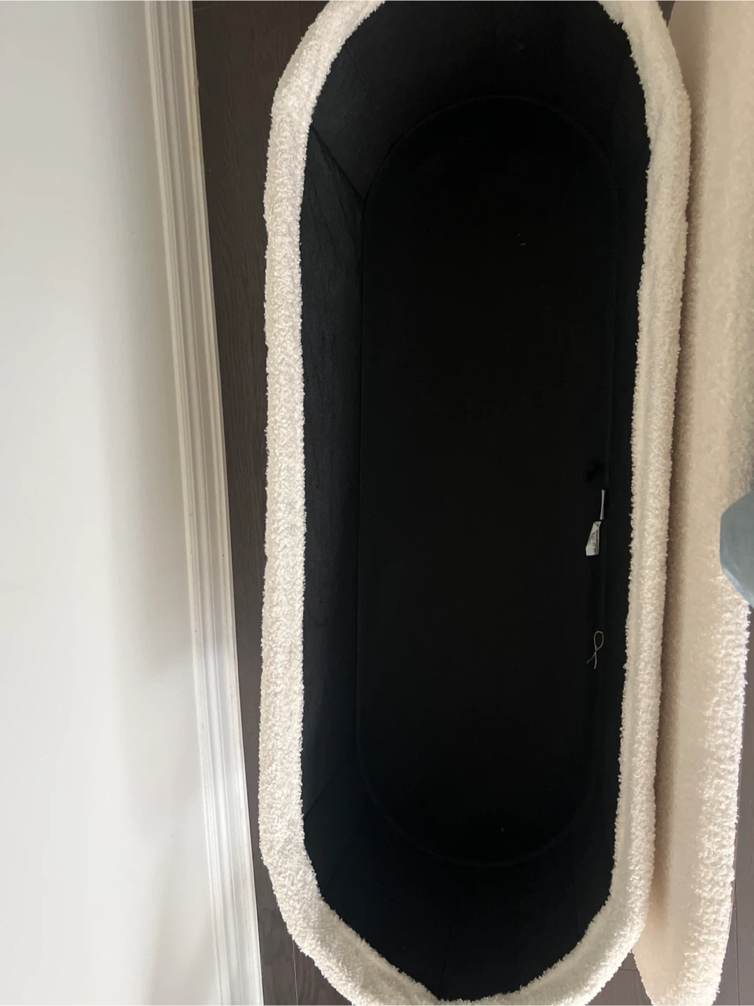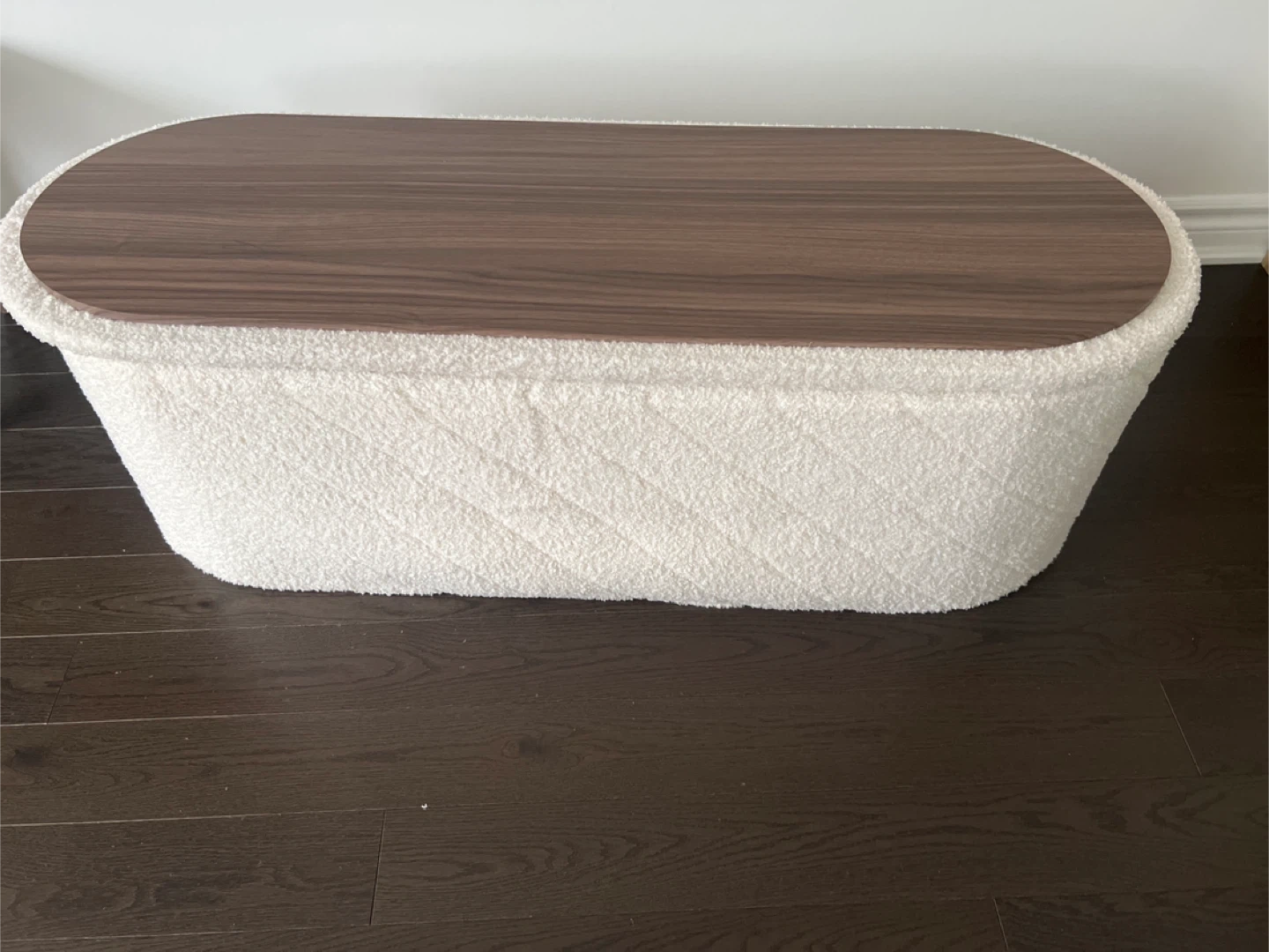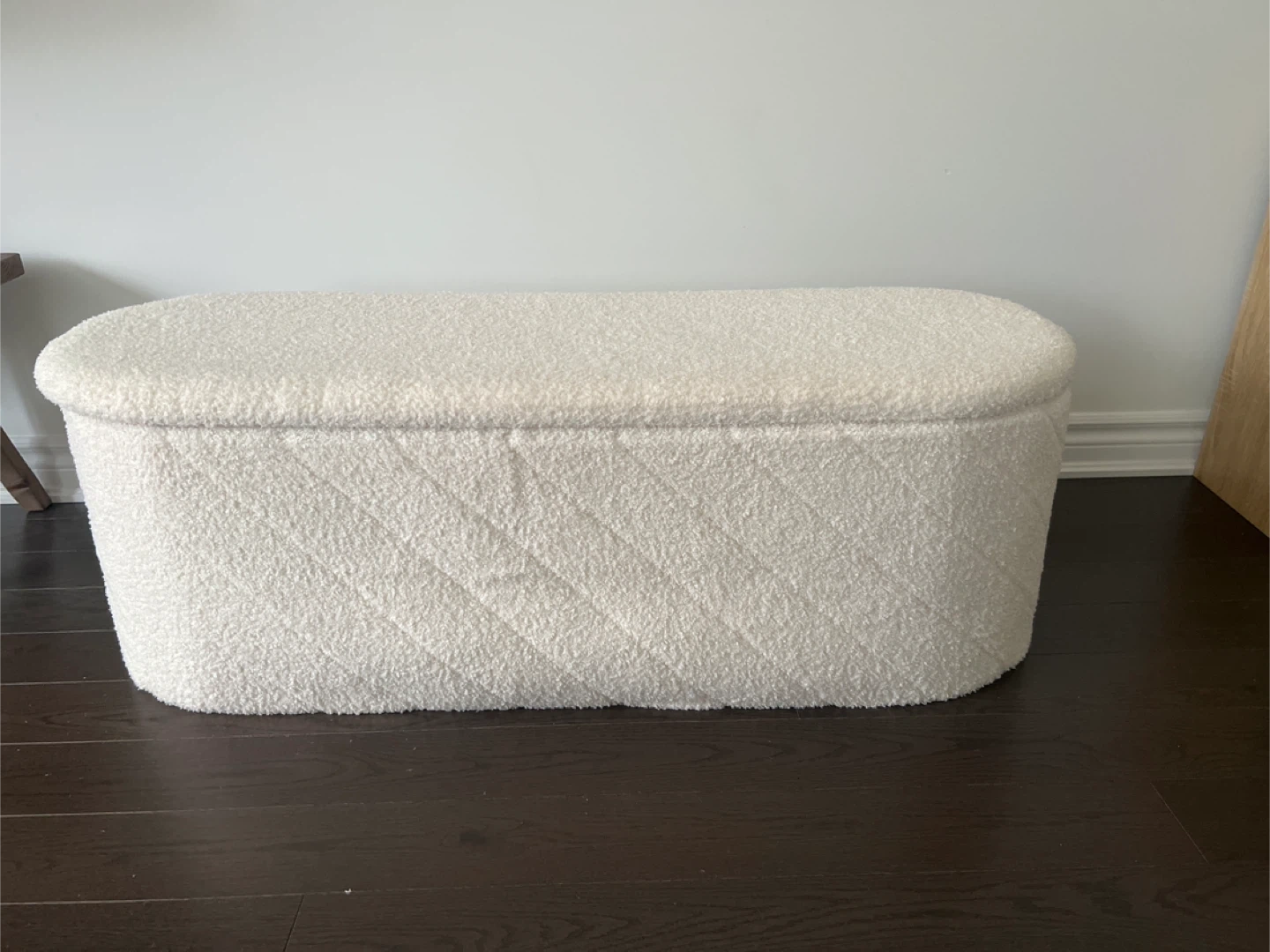 Here's a stylish boucle storage ottoman bench! It's in great condition and would be a lovely addition to any room. It offers both comfortable seating and convenient storage.