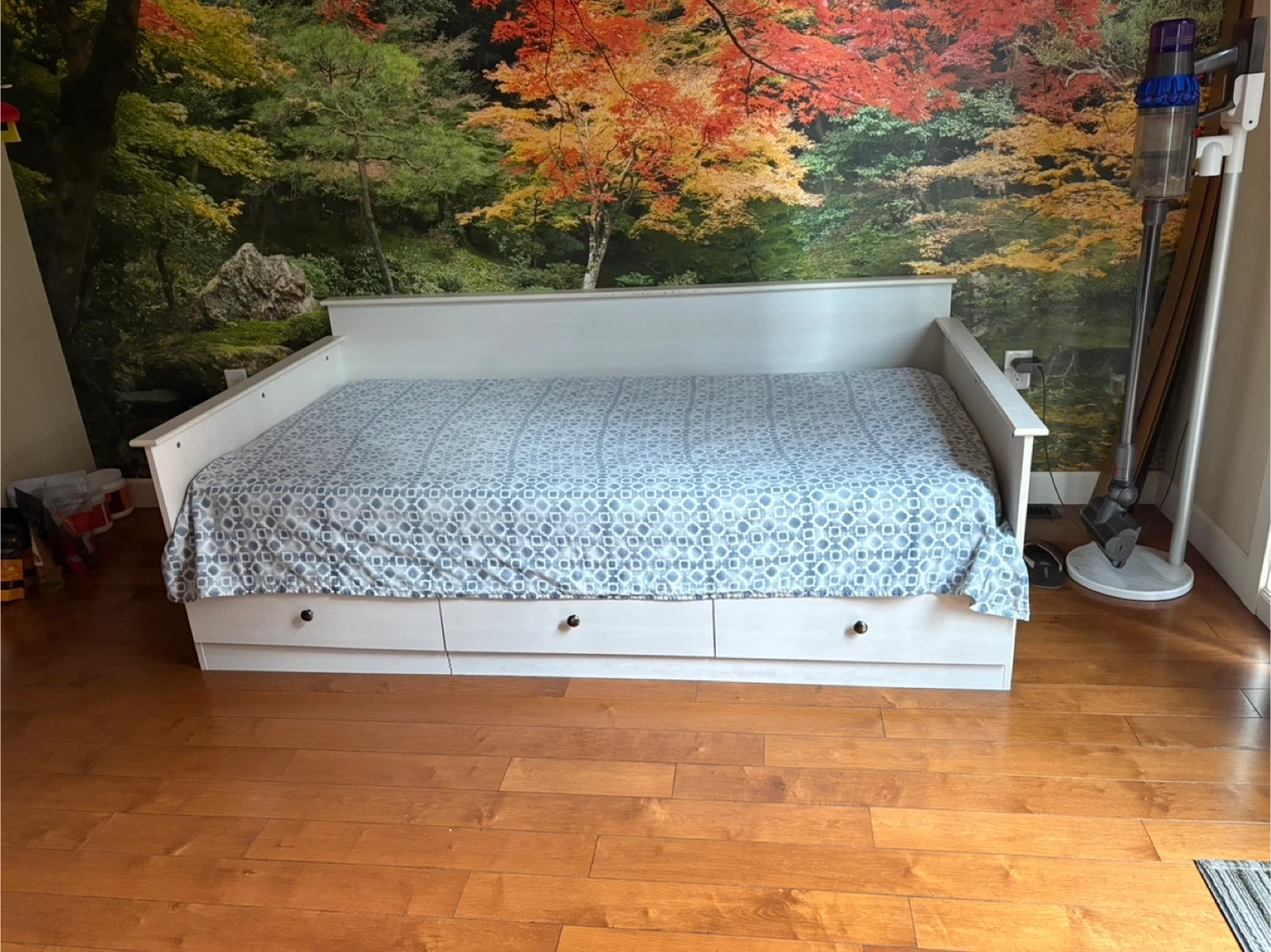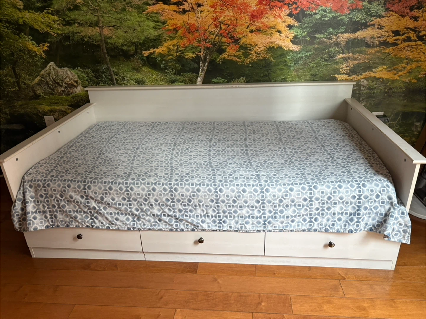 Selling a daybed in good condition! It features a clean white finish and handy drawers for extra storage. Perfect for a guest room or a cozy spot in your living area . IKEA brimnes day bed , it has little crack at the bottom but we are using it from 2021.