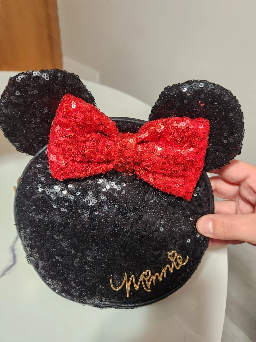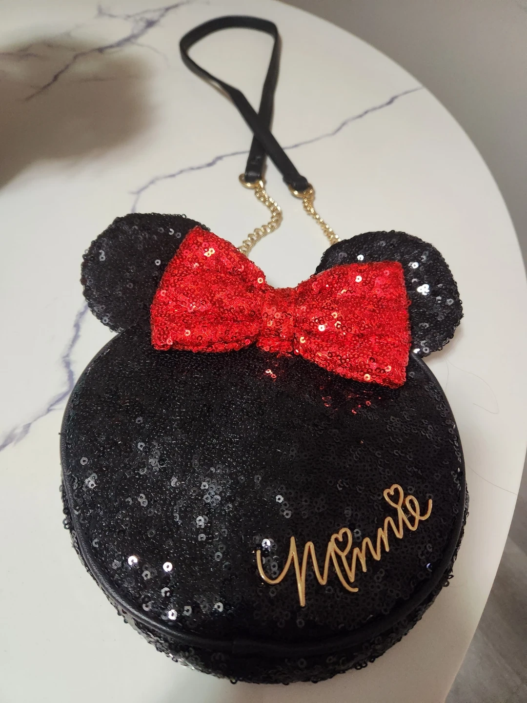 Super cute Minnie Mouse crossbody bag with sequins! It has a red sequin bow and a gold-tone chain strap. Perfect for adding a touch of Disney magic to any outfit!