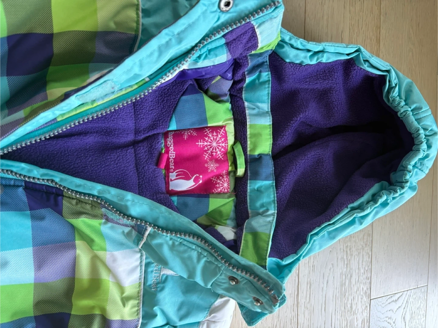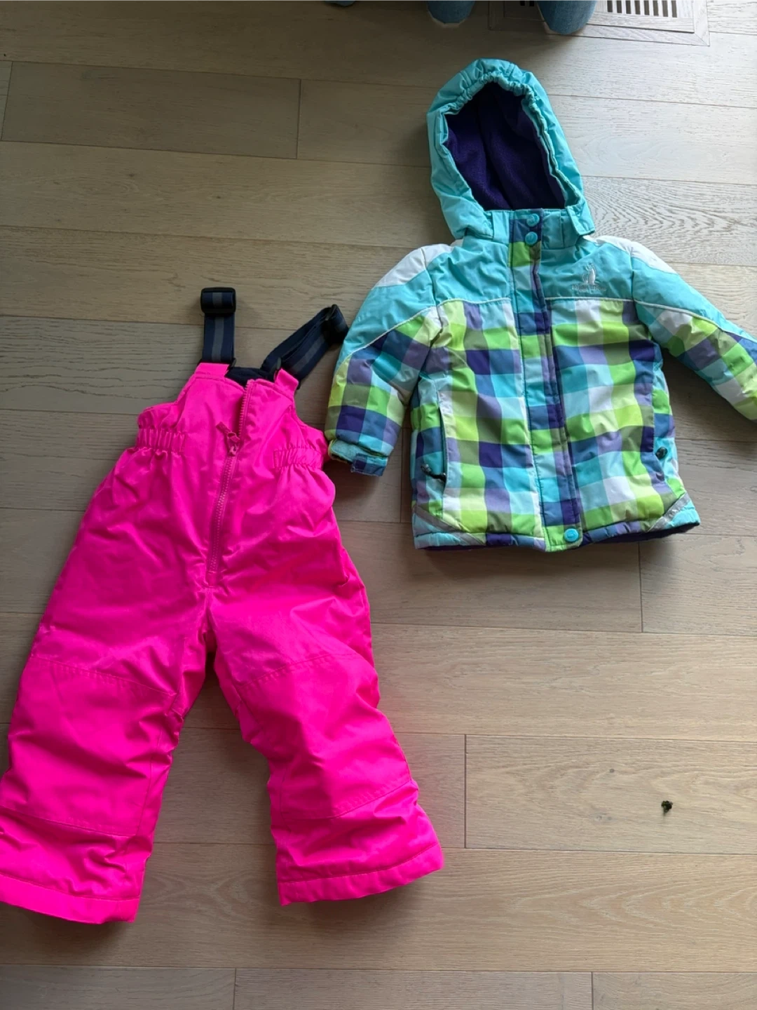 Here's a cute snowsuit set for your little one! It's a size 3T and includes both the jacket and snow pants. The jacket has a colourful plaid pattern, and the pants are a bright pink. Perfect for keeping your child warm and dry this winter season!