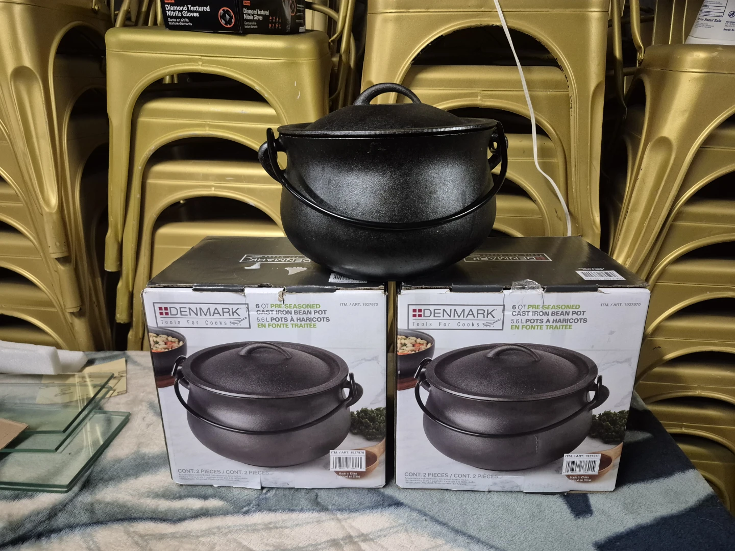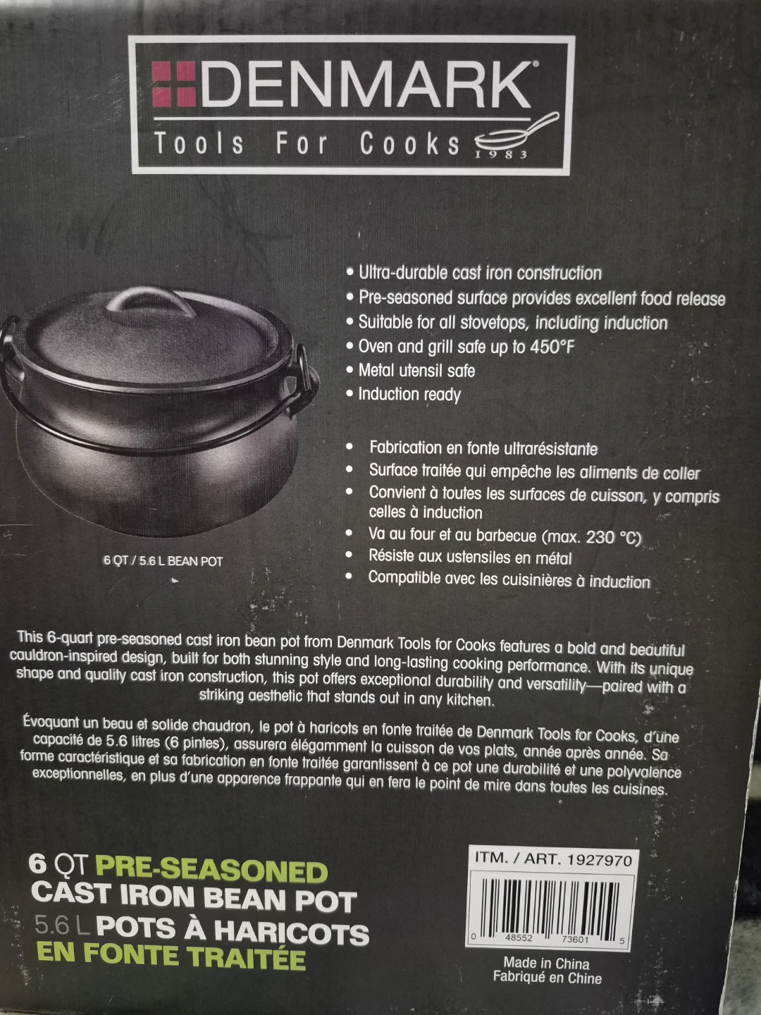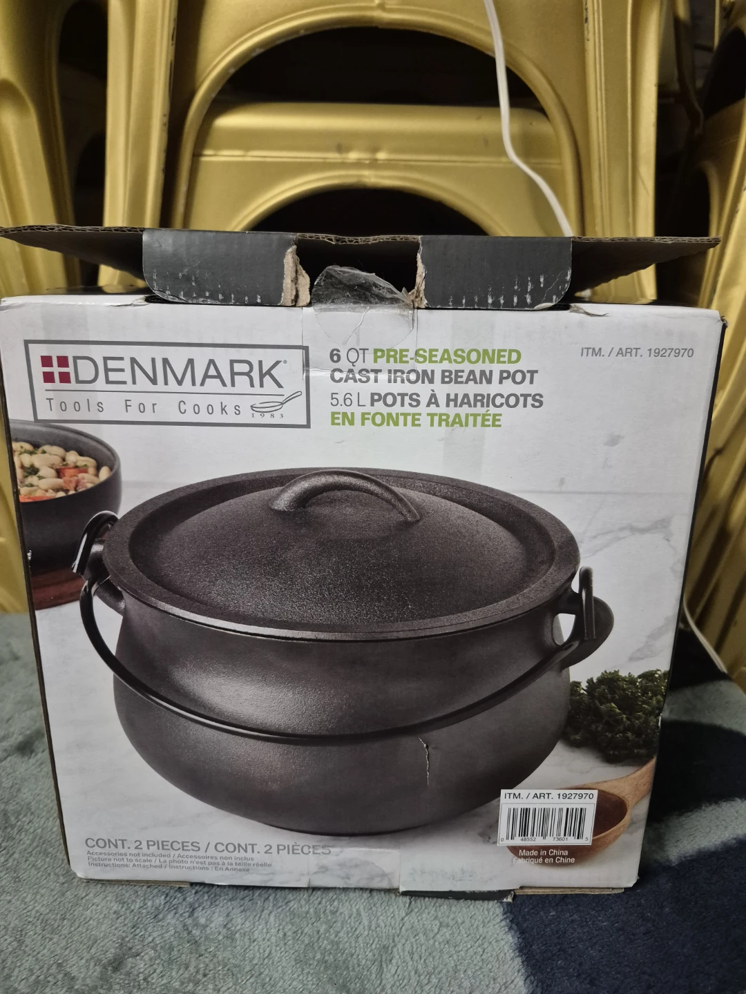 I have a brand new and gently user Denmark 6 QT pre-seasoned cast iron bean pot for sale! It features an ultra-durable cast iron construction with a pre-seasoned surface that provides excellent food release.