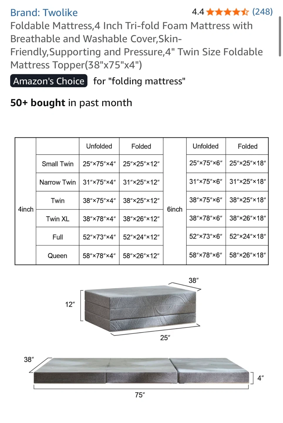 I'm selling a Twolike foldable mattress! It's a 4-inch tri-fold foam mattress with a breathable and washable cover. It's skin-friendly, supportive, and pressure-relieving. It's a twin size, measuring 38"x75"x4" unfolded and 38"x25"x12" folded. Originally bought for $99.99
