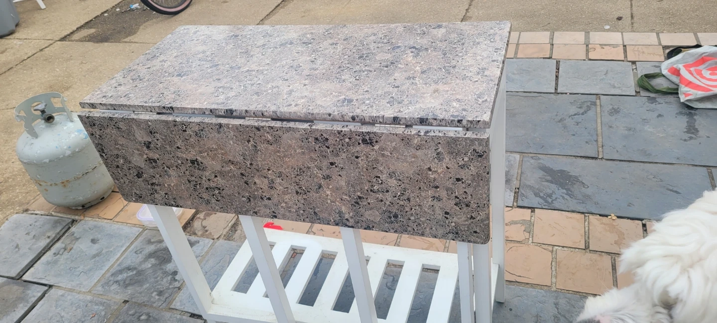 I'm selling a kitchen island table with two stools. The table has a drop leaf and a white frame with a faux granite top. The stools have matching faux granite tops and white frames. It's in good condition!