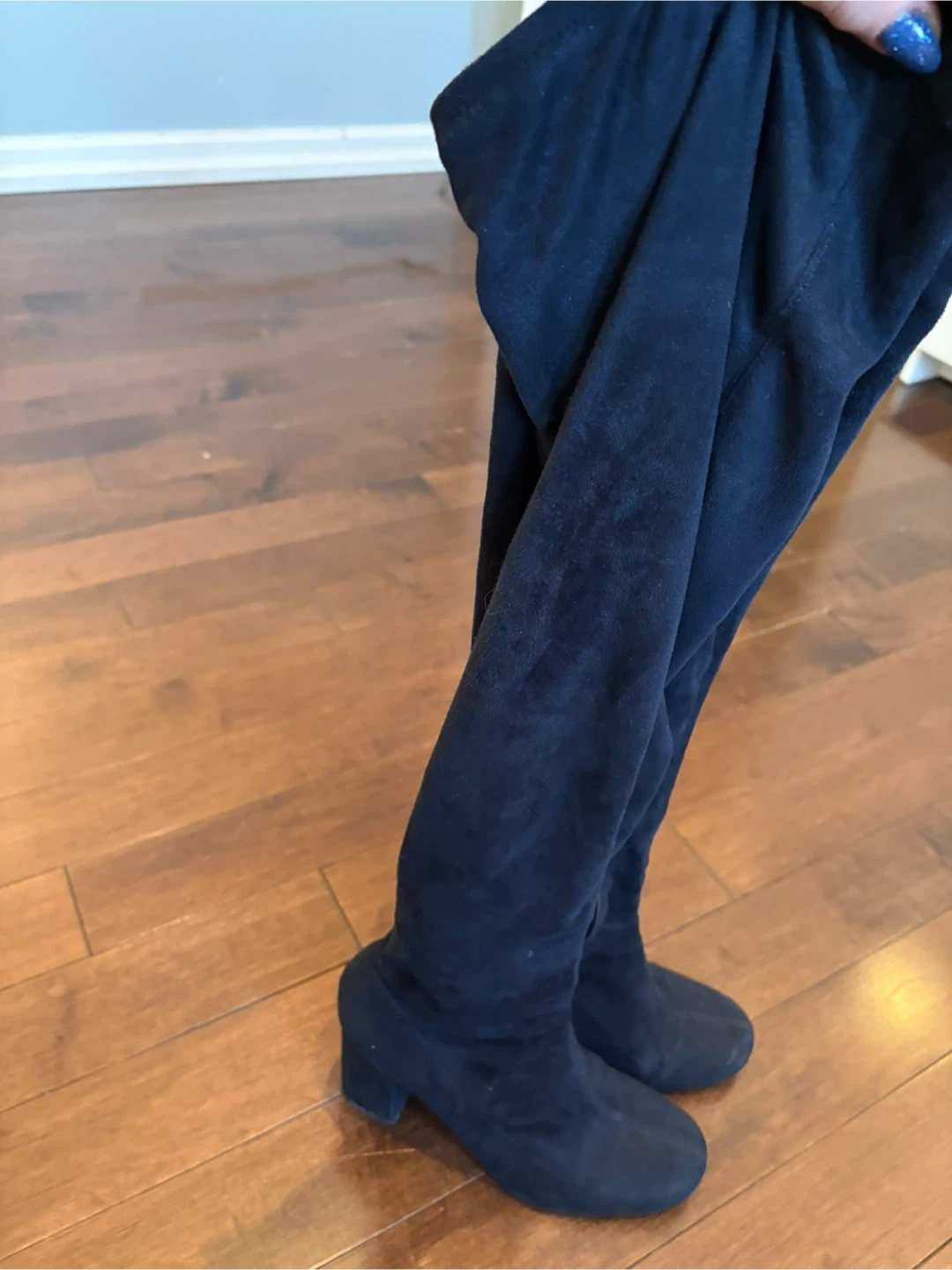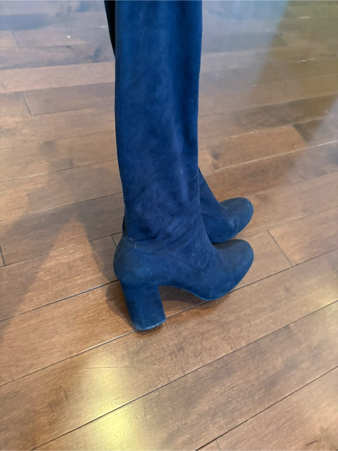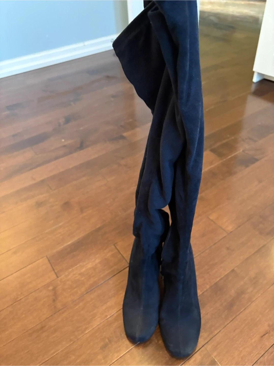 These are a pair of stylish over-the-knee boots in a beautiful blue suede material. They have a comfortable heel height, perfect for adding a touch of elegance to any outfit. These boots are in great condition and ready for a new owner!